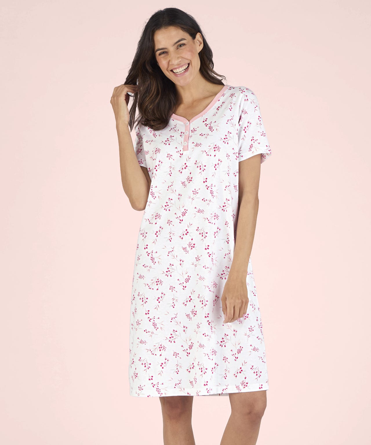 Perfect for warm nights, our short sleeve nightdress is made from soft cotton jersey. With button neck detail and contrast piping for a pretty look. With button opening and contrast piping detail. Jersey. 100% Cotton. Length: 97cm (38") approx.