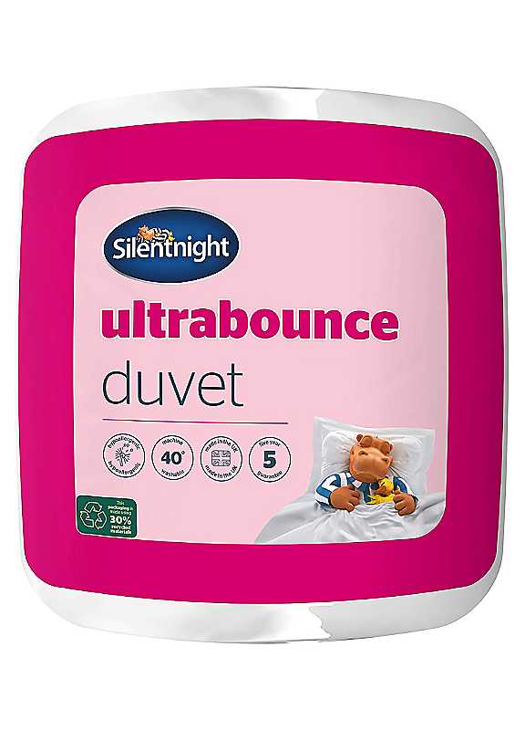 Add some bounce into your bedding and experience unbeatable comfort. Soft, comfortable and ultra-bouncy the Silentnight ultra bounce duvet is filled with spiral-shaped fibres that return to shape to keep your duvet feeling lofty, full and cosy, encased in soft-touch covers for extra comfort. This product is made right here in the UK and comes with a 5-year manufacturer's guarantee. The duvet is hypoallergenic which means it is kind to the skin and does not include any contents likely to cause allergies. Fully machine washable so you can keep them feeling just like new for longer. Silentnight is the UK's most trusted sleep brand with over 70 years of experience in creating products that offer solutions for every sleeper. Silentnight Duvet Features: Made in UK Machine washable Cover: Microfibre Filling: Hollow fibre channel stitch