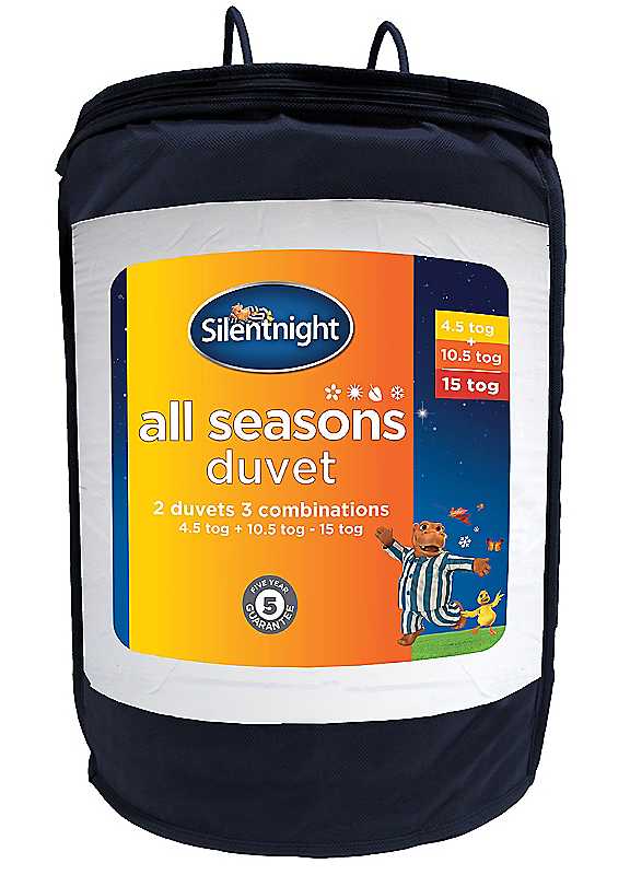 Set includes a 10.5 tog and 4.5 tog duvet which can be used separately or combined together to create a 15 tog duvet. Silentnight Duvet Features: Made in UK Soft to touch Embossed square pattern Bounce-back Simply to attach poppers Machine washable Polyester-fibre filling Microfibre cover