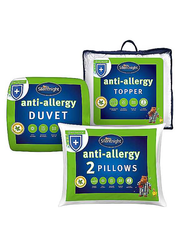 SPECIAL OFFER! Save 50% off individual selling prices when buying as a complete bundle set. Set consists: 10.5 Tog Duvet, Pair of Pillows and Mattress topper. People with allergies need a duvet that gives them a restful night's sleep. This washable duvet and pillows are made with an anti allergy Hollowfibre filling that protects against dust mites and bacteria. Silentnight Anti Allergy Bundle Features: Made in UK Washable Microfibre Polyester Cover Hypo-Allergenic