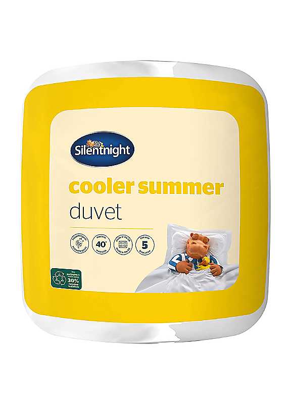 The Silentnight Cooler Summer duvet will help to keep you feeling fresh and comfortable in bed during the summer months. The duvet is filled with a lightweight hollowfibre, so it won't feel heavy or restrictive. The duvet is covered in microfibre that is moisture wicking to help keep you cool. It's also soft to the touch to offer exceptional comfort throughout the night. The duvet is made right here in the UK and comes with a five year manufacturer's guarantee for peace of mind, so you can sleep soundly with your purchase. Our Cooler Summer duvet is hypoallergenic which means it does not contain any materials that are likely to cause allergies. It is also machine washable at 40°C which means you can keep your duvet fresh and clean for longer. At Silentnight we understand the importance of a good night's sleep and this starts with choosing the right bedding. Tog ratings are an indication of how warm the duvet will be when you are sleeping underneath it, so the higher the tog rating, the warmer you will be. We always recommend a low tog for warmer summer months 4.5/7.5 tog and a higher tog for winter 13.5/15 tog. If you would prefer to use only one duvet all year round then a 10.5 tog is most suitable. However, for optimum sleep you should keep your body at a comfortable temperature and changing togs during seasons will help you to achieve this. The Cooler Summer collection also includes pillows and protectors that are all filled with lightweight fibres for a comfortable night's sleep. Silentnight are the UK's most trusted bed brand with over 70 years' experience in creating products to help the whole family get that 'great sleep' feeling. Layers of soft hollowfibre that bounce back to shape time and time again 4.5 tog is suitable for warmer summer months Hypoallergenic, made in the UK, machine washable at 40°C, encased in a soft microfibre cover for great recovery wash after wash 5 year manufacturer's guarantee. Silentnight Duvet Features: Made in UK Machine wash at 40 degrees Cool tumble dry 100% Polyester Microfibre