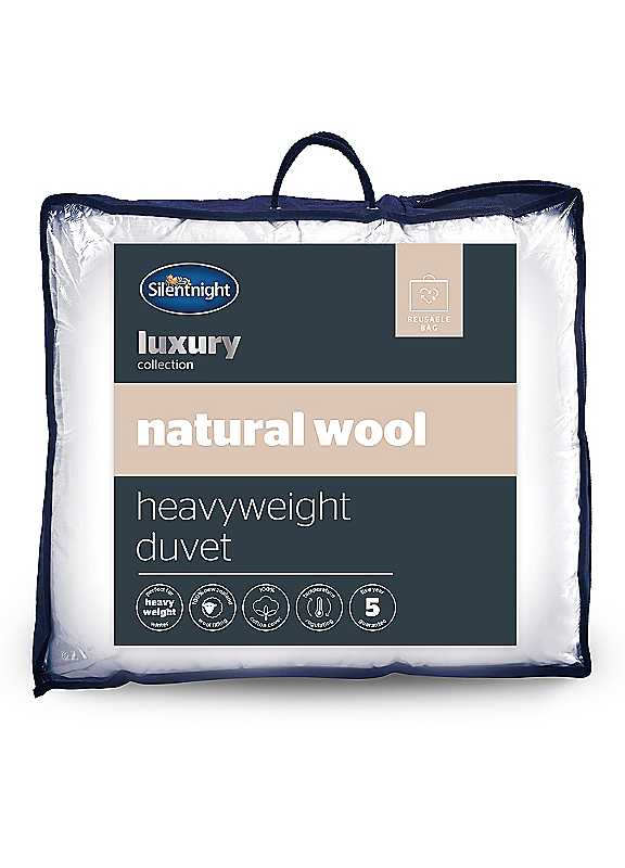 Wrap yourself in this naturally luxurious 100% New Zealand Wool duvet, for a blissful night of cocooning comfort. Beautifully crafted with naturally breathable, hypoallergenic and temperature regulating wool, so you can wake up feeling refreshed. This natural wool filling is wonderfully insulating, but also lightweight and breathable, to keep you at a comfortable temperature all night long. The sumptuously soft 100% cotton, paired with the deep fill of wool, provides superior comfort and breathability, for a luxuriously relaxing night's sleep. Silentnight are the UK's most trusted sleep brand with over 75 years' experience in creating products for every sleep solution. Made in UK Machine washable Tumble dry low heat NATURALLY LUXURIOUS: Deeply filled with wonderfully insulating 100% New Zealand wool, offering superb softness and cocooning comfort for a luxurious night's sleep. NATURALLY BREATHABLE: The sumptuously soft 100% cotton cover and wool filling are naturally breathable and hypoallergenic, providing you with superior comfort and freshness all night long. TEMPERATURE REGULATING: Beautifully crafted with naturally breathable yet insulating wool, which is better than any other fibre at providing temperature regulating benefits, keeping you at a comfortable temperature all night long. HEAVYWEIGHT: Suitable for Autumn & Winter seasons. GUARANTEE: Comes with a 5-year manufacturer's guarantee. Machine washable 100% Cotton cover