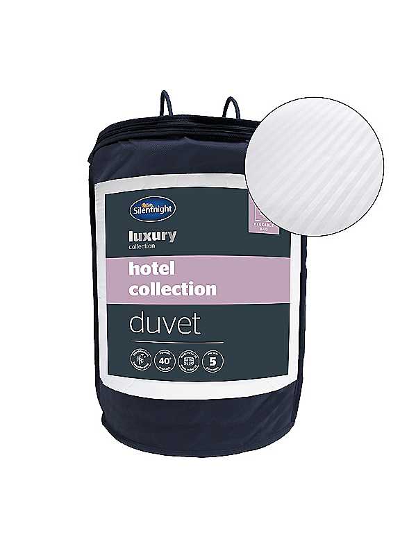Indulge in the 5 star comfort of a hotel every night with this luxuriously soft and silky boutique style duvet, featuring an elegant embossed finish. The Silentnight Hotel Collection duvet is encased in a wonderfully stylish and incredibly soft check embossed cover and filled with the finest sumptuous fibres for luxurious comfort. The Silentnight Hotel Collection Duvet is made right here in the UK and come with a 5 year manufacturer's guarantee for peace of mind. The duvet is hypoallergenic which means it is kind to skin and does not include any contents likely to cause allergies. You can keep enjoying hotel quality night after night as it's are fully machine washable. Silentnight are the UK's most trusted bed brand with over 70 years' experience in creating products that offer solutions for every sleeper. 5 STAR COMFORT: Indulge in the 5 star comfort of a hotel every night with this luxuriously soft and silky boutique style duvet. STYLISH SOFT TOUCH COVER WITH SUMPTUOUS FILLING: Featuring an elegant, embossed finish which is soft to the touch and filled with the finest fibres for a blissful slumber. 10.5 TOG: This tog duvet will keep you warm and comfortable in all seasons. 13.5 TOG: This tog duvet will provide extra warmth, making it ideal for winter. HYPOALLERGENIC: Kind to skin and does not include any contents likely to cause allergies. MACHINE WASHABLE: Fully machine washable so you can keep enjoying hotel quality night after night. MADE IN THE UK: Crafted with love in the UK. QUALITY GUARANTEE: 5 year manufacturer's guarantee. . Silentnight Duvet Features: Made in UK Machine wash at 40 degrees Cool tumble dry 100% Polyester Microfibre