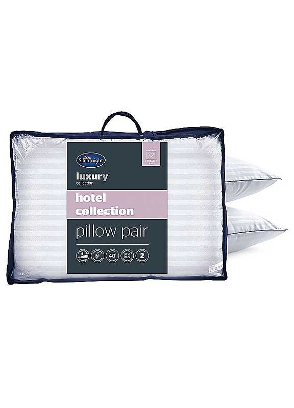 Indulge in the 5 star comfort of a hotel every night with luxuriously soft and silky boutique style pillows, featuring an elegant embossed finish and stylish piped edging. The Silentnight Hotel Collection Pillows are encased in beautifully soft, stripe embossed covers with delicate navy blue piped detail and filled with the finest fibres for luxurious comfort. The Silentnight Hotel Collection Pillows are made right here in the UK and come with a 2 year manufacturer's guarantee for peace of mind. They are hypoallergenic which means they are kind to skin and do not include any contents likely to cause allergies. You can keep enjoying hotel quality night after night as they are fully machine washable. Silentnight are the UK's most trusted bed brand with over 70 years' experience in creating products that offer solutions for every sleeper. 5 STAR COMFORT: Indulge in the 5 star comfort of a hotel every night with luxuriously soft and silky boutique style pillows. STYLISH SOFT TOUCH COVER WITH SUMPTUOUS FILLING: Featuring an elegant, embossed design with stylish piping detail and filled with the finest fibres for a blissful slumber. HYPOALLERGENIC: Kind to skin and does not include any contents likely to cause allergies. SOFT/MEDIUM SUPPORT: Use one pillow for soft comfort or two pillows for firmer support. MACHINE WASHABLE: Fully machine washable so you can keep enjoying hotel quality night after night. MADE IN THE UK: Crafted with love in the UK. QUALITY GUARANTEE: 2 year manufacturer's guarantee. . Silentnight Pillows Features: Made in UK Machine wash at 40 degrees Cool tumble dry 100% Polyester Microfibre