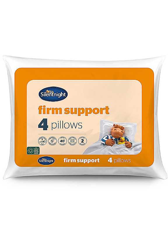 Providing firm support for your head and neck for ultimate comfort while you sleep. The Silentnight firm support pillow has a fibre core at the centre and is surrounded by deep-filled bouncy fibres and encased in a soft-touch cover, resulting in a plump and supportive pillow.The pillows come with a 2-year manufacturer's guarantee and are hypoallergenic which means they do not contain any materials that are likely to cause allergies. They're even machine washable so you can keep them feeling just like new for longer.Silentnight is the UK's most trusted sleep brand with over 75 years of experience in creating products that offer solutions for every sleeper. Made in UK FIRM SUPPORT: Providing firm support for your head & neck for ultimate comfort while you sleep PERFECTLY PLUMP: Featuring a fibre core within the centre of the pillow surrounded by deep-filled bouncy fibres, resulting in a plump & supportive pillow SOFT-TOUCH COVERS: Encased in a smooth microfibre cover with stylish stitching detail HYPOALLERGENIC: Kind to skin & does not include any contents likely to cause allergies MACHINE WASHABLE: Machine washable to keep your pillows feeling fresh & hygienic MADE IN THE UK: Proudly made with care in the UK QUALITY GUARANTEE: 2 Year manufacturer's guarantee Pack of 4 Machine washable Tumble dry low 100% Microfibre Filling: Hollowfibre with Core