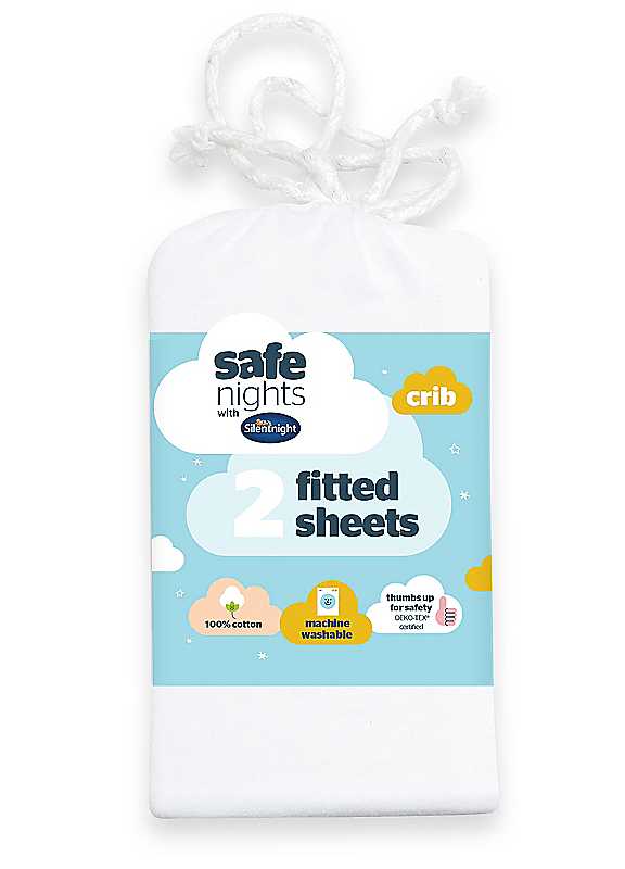 SOFT COSY COMFORT: Offering breathable yet cosy comfort for your little one throughout the night.CERTIFIED SAFETY: Produced in an OEKO-TEX® certified factory, this product has the ultimate seal of approval for safety standards.BREATHABLE COTTON JERSEY: 100% breathable cotton jersey which feels super soft and gentle on the skin.CRIB SIZE: The fitted sheets measure 90 cm x 40 cm with a depth of 11 cm.PACK OF 2: Each pack includes 2 fitted sheets so there's always a spare on hand.SECURE FIT: Elasticated corners to fit snugly over your little ones' mattresses.MACHINE WASHABLE: Tested to 50 machine washes, tumble dry safe.It's important that sheets fit neatly around your baby's mattress for comfort and safety. The Silentnight Safe Nights fitted sheets are essential for every nursery. Made from 100% cotton which is soft and breathable with your babies' comfort in mind, always. The handy 2-pack means you will always have a spare. The sheets feature elasticated edges to provide a snug fit to your baby's mattress.Produced in an OEKO-TEX® certified factory, this product has the ultimate seal of approval for safety standards. Fully machine washable and can be tumble dried on low heat. The sheets are durable and designed to stand the test of time, they have been tested to withstand 50 washes.Part of Silentnight's award-winning Safe Nights collection, creating safe and breathable products for your baby. Made in UK Pack of 2 Machine washable Low temperature tumble dry 100% Cotton