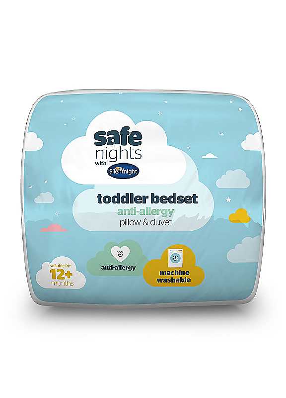 DUAL FRESHNESS PROTECTION: Combining anti-allergy and anti-bacterial protection for a fresh, hygienic sleep.SOFT & SLIM PILLOW: Little heads and necks need a different pillow height and support for adults, so we have designed this to be uniquely slim and softly supportive, perfect for little dreamers.4.5 TOG: The 4.5 tog duvet keeps your little one at just the right temperature to prevent overheating.MADE FOR LITTLE ONES: This cot bed duvet has been designed especially with your little one's comfort in mind. Suitable for 12 months+.MACHINE WASHABLE: Easy to care for, simply machine wash and tumble dry on low heat.AWARD WINNING: Part of Silentnight's award-winning Safe Night collection, creating safe and breathable products for your baby that you can trust.The Safe Nights Toddler Bedset by Silentnight is soft and breathable, designed specifically with your little one's comfort in mind. Filled with anti-allergy fibres for a comfortable, hygienic sleep with anti-bacterial fibres protecting your little one from bacteria that may ordinarily live in their duvet. The set contains a soft and slim pillow that has been uniquely designed with your little one's comfort in mind. Little heads and necks need a different pillow height and support for adults, so we have designed this to be uniquely slim and softly supportive. The 4.5 tog duvet keeps your little one at just the right temperature to prevent overheating.From the award-winning Silentnight Safe Night's collection, you can sleep soundly in the knowledge your little one is receiving the care and comfort they need through the night.This product is suitable for little ones aged 12 months and older.Silentnight is the UK's number one sleep brand, with over 70 years of experience in creating products that offer solutions for every sleeper. Made in UK Machine washable Low temperature tumble dry Cover made from 80% Polyester, 20% Cotton 100% Polyester Anti Allergy filling
