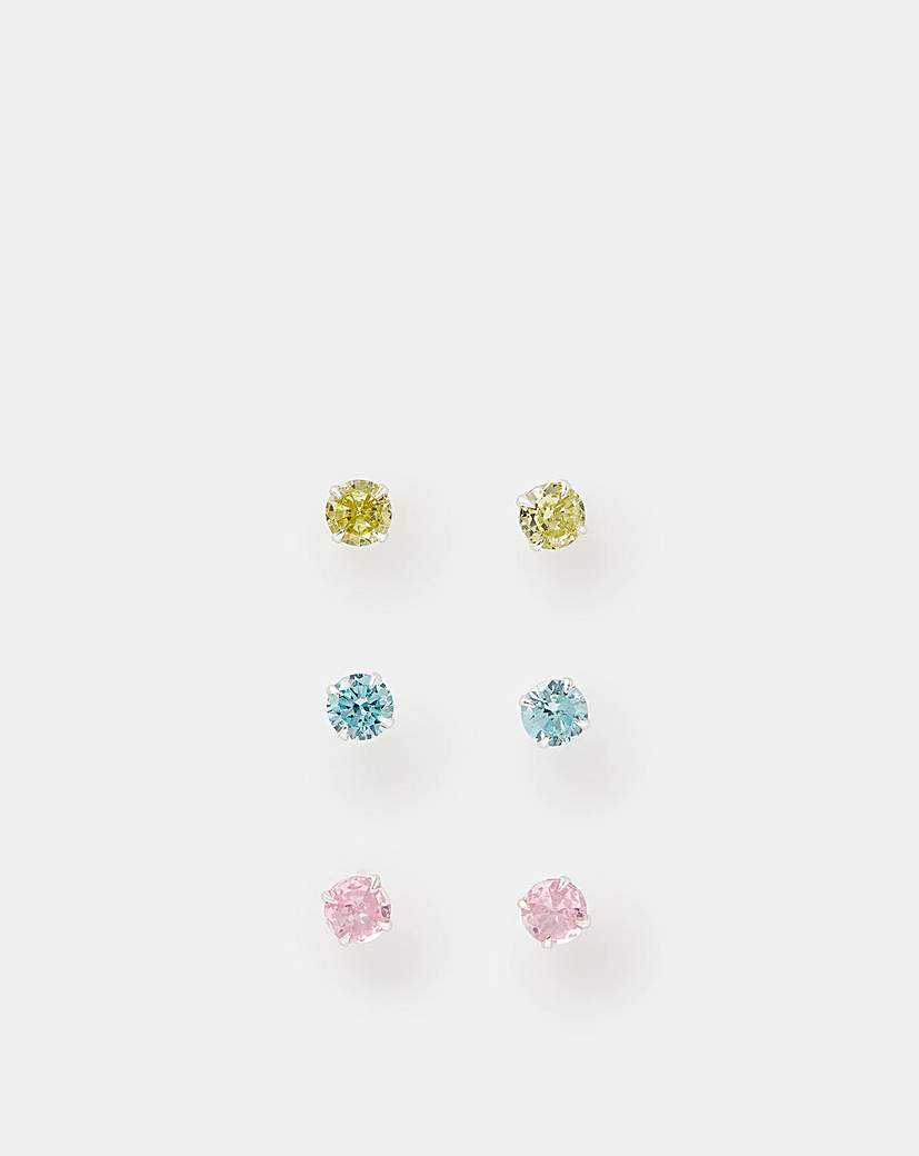 3-Pack Sterling Silver Diamante Stud Earrings It's time to shine. Perfect for everyday styling, these sterling silver earrings showcase dazzling diamantes in pastel hues. Three included. Non-refundable. Composite: Cubic Zirconia 28% , Sterling Silver (Recycled) 72%
