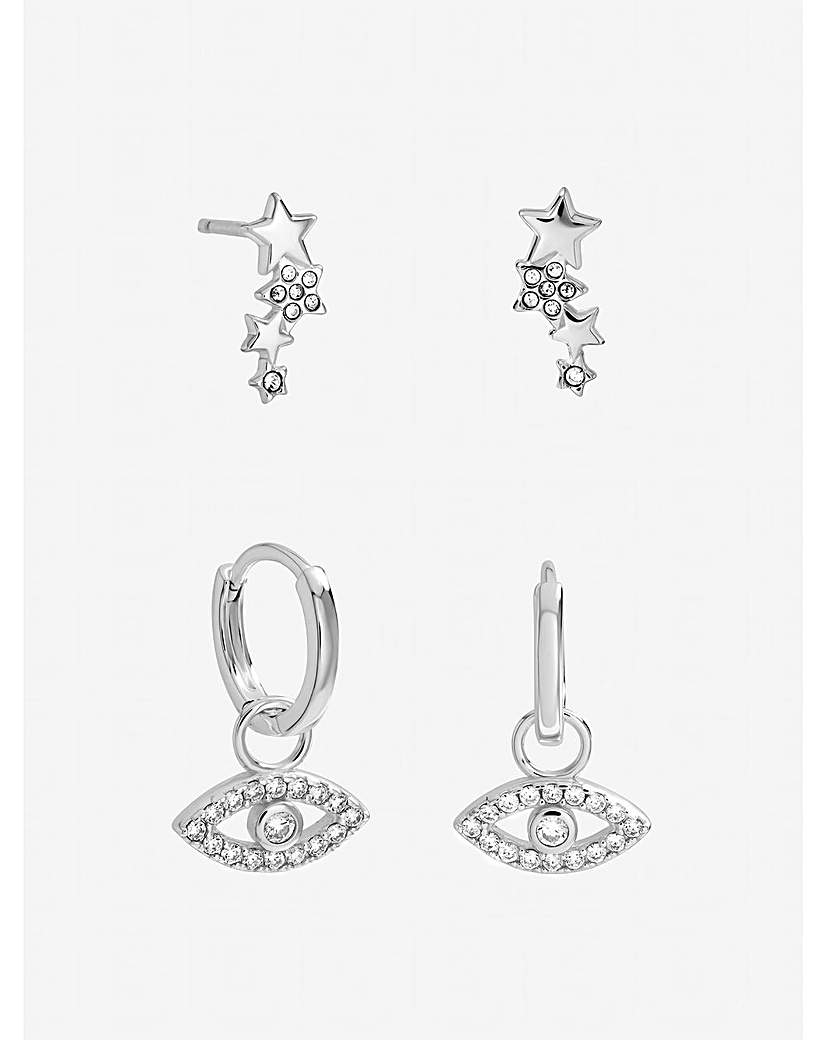 Inicio Sterling Silver Plated Celestial Earrings - Pack of 2 Our Inicio Celestial Earrings combines modern style with symbolic charm. Crafted in polished sterling silver plating, the pack includes a delicate star climber and an evil eye pave charm huggie hoop, perfect for mixing, matching, and layering. Lightweight and versatile, these earrings add a subtle, contemporary touch to everyday outfits or dressier looks. Our 3 micron sterling silver plating uses a heavy, premium layer of silver that delivers a brighter finish, greater resistance to tarnish and wear, and significantly longer lasting quality than standard plated jewellery. Fastening: Post and catch Material: Sterling silver plated brass Width: 13mm, 20mm, length: 13mm, 20mm. Non-returnable: in the interest of hygiene we are unable to exchange or refund this item unless faulty, this does not affect your statutory rights.
