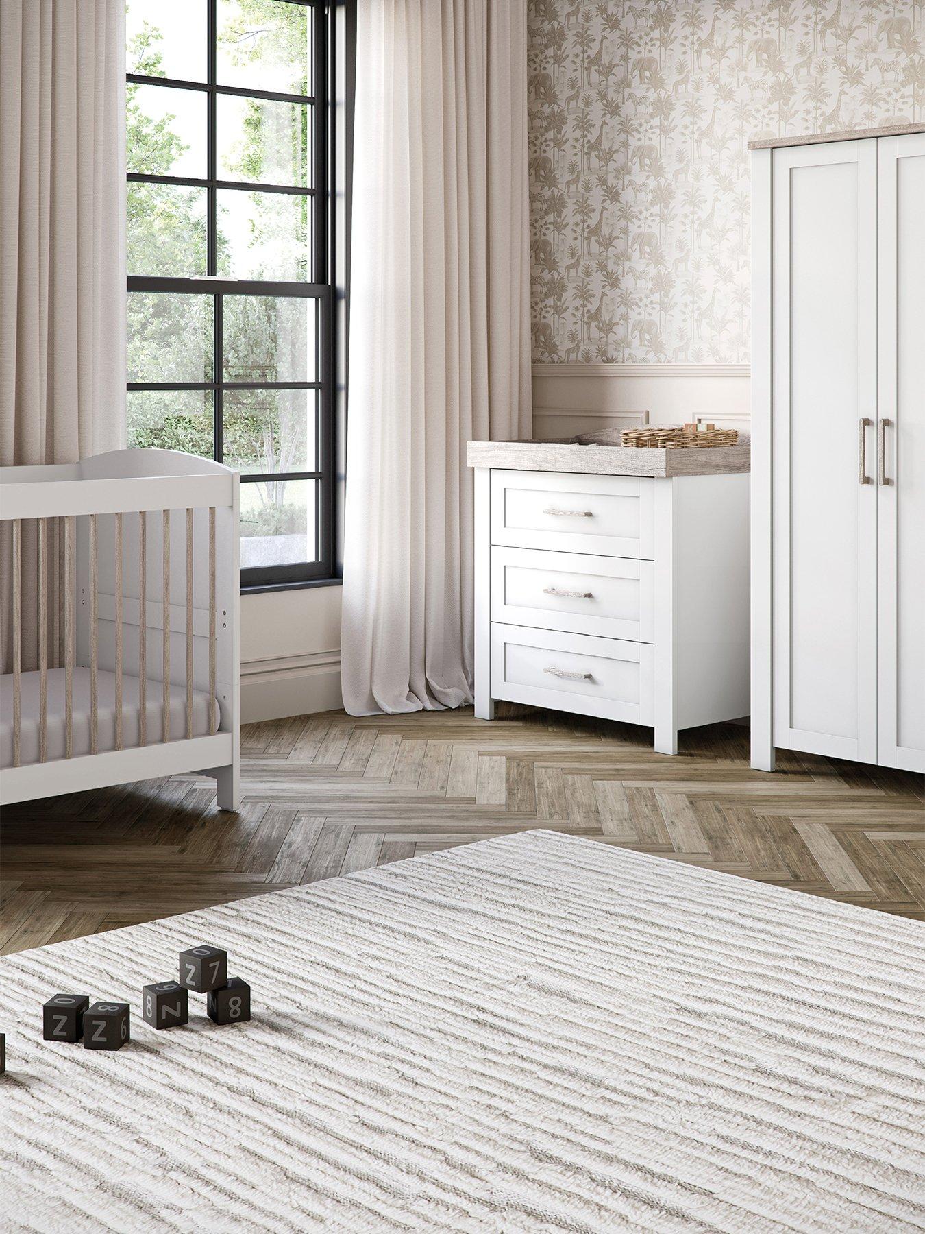 Silver Cross Valencia 3 piece set Timeless white with natural ash accents Create your dream nursery with the Silver Cross Valencia 3-piece nursery furniture set, designed to grow with your little one from newborn to toddler. Featuring a timeless white finish and natural ash accents, the Valencia set creates a calming, fresh canvas for your nursery. This versatile, two-tone collection includes a cot bed that easily converts to a toddler bed, a dresser with removable changer top for added longevity, and a spacious wardrobe, all crafted for durability over the years. Cot to toddler bed The Valencia cot bed will suit every stage of your little one's growth from their first night at home up to their toddler years. With three mattress heights, the cot bed should be used in the highest setting for your newborn and lowered gradually as they start to roll, sit and stand. When the cot railings are no longer needed, they can be easily removed to leave behind a toddler bed using the same base. All cot beds are compatible with the Silver Cross TrueFit mattress collection. Dresser Keep your nursery organised in Valencia's spacious three-drawer dresser, with plenty of room for clothing and bedding. For nappy and outfit changes, attach the changer top to your dresser or, when no longer needed, use as an extra storage basket. Wardrobe The Silver Cross Valencia wardrobe is the perfect spot to display your baby's clothing, with two hanging rails and shelves providing lots of space. As your baby grows, the lower rail and shelf can be easily removed for larger garments. Depth: 145 CM Height: 180 CM Material Content: Laminated Chipboard, MDF, HDF, Timber Pine, Oak Laminated Width: 85 CM Age Range: Birth to 4 years Assembly: Self Assembly From newborn to toddler (approx. 4 years) Cot bed converts easily to a toddler bed to grow with your child Three mattress heights to lower gradually as they grow Full size dresser with changer top and three deep drawers Full size wardrobe with two hanging rails and two shelves Timeless white finish with natural ash accents