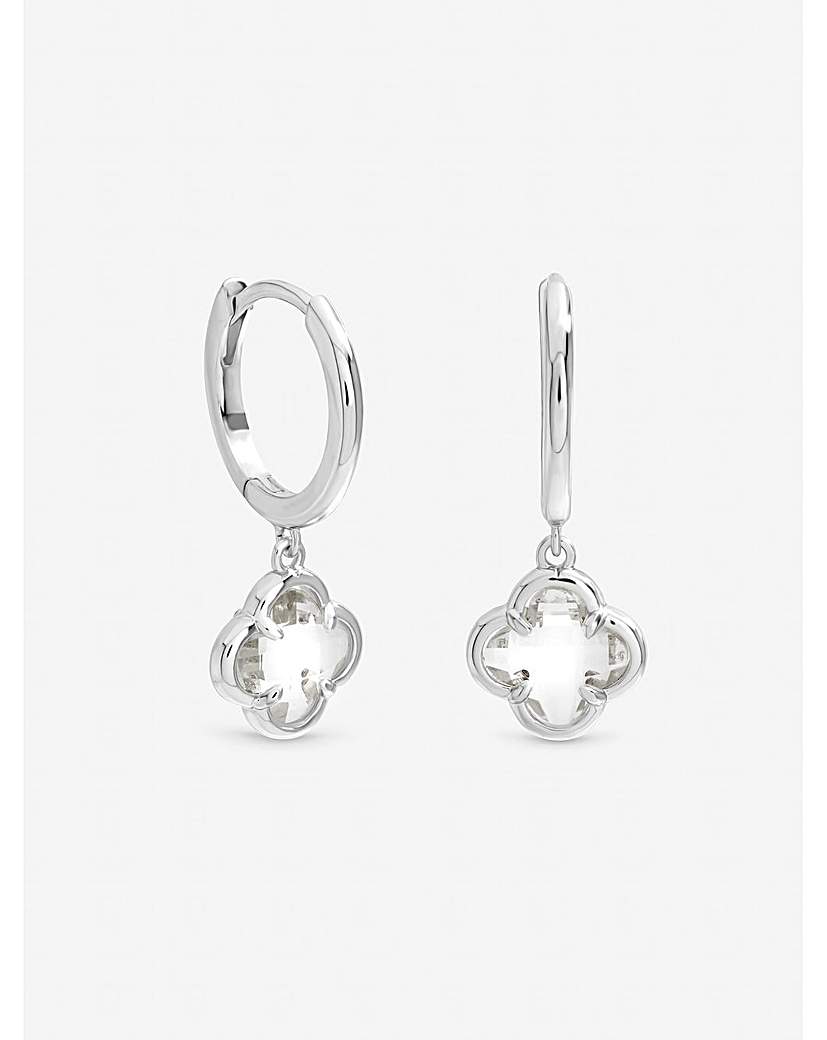 Inicio Sterling Silver Plated Crystal Clover Charm Huggie Hoops Our Inicio Crystal Clover Charm Huggie Hoops offer timeless charm with a bright finish. These small, polished huggie hoops are crafted in sterling silver plating and fit closely to the earlobe. Each hoop suspends a delicate clover charm featuring a luminous crystal stone at its centre. They provide comfortable, secure wear and add a lucky, sophisticated accent to your everyday style. Our 3 micron sterling silver plating uses a heavy, premium layer of silver that delivers a brighter finish, greater resistance to tarnish and wear, and significantly longer lasting quality than standard plated jewellery. Fastening: Hoop Material: Sterling silver plated brass Width: 24mm, length: 24mm. Non-returnable: in the interest of hygiene we are unable to exchange or refund this item unless faulty, this does not affect your statutory rights.