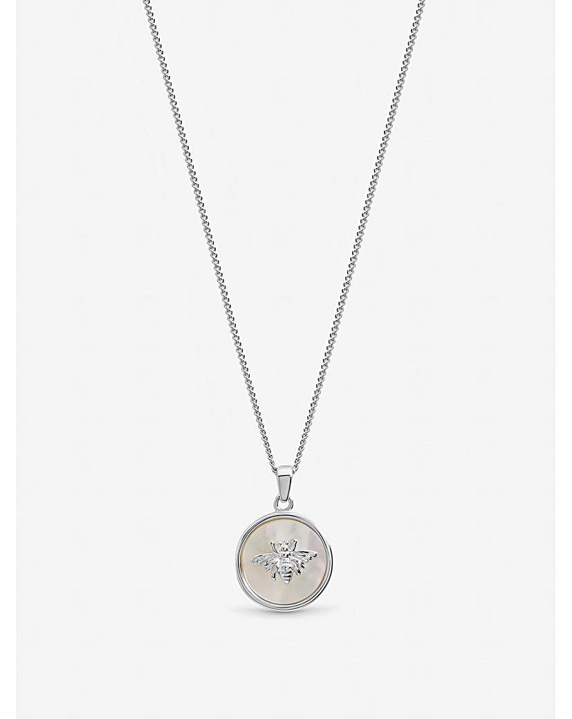 Inicio Sterling Silver Plated Mother Of Pearl Bumblebee Pendant - Gift Pouch Our Inicio Mother of Pearl Bumblebee Pendant combines whimsical charm with understated elegance. Crafted in polished sterling silver plating, the pendant features a delicate bumblebee design with a luminous mother of pearl inlay that catches the light beautifully. Lightweight and versatile, it can be worn alone for a subtle statement or layered with other necklaces for a curated, playful look. Our 3 micron sterling silver plating uses a heavy, premium layer of silver that delivers a brighter finish, greater resistance to tarnish and wear, and significantly longer lasting quality than standard plated jewellery. Fastening: Lobster clasp Material: Sterling silver plated brass Width: 15mm, length: 15mm. Comes in gift pouch