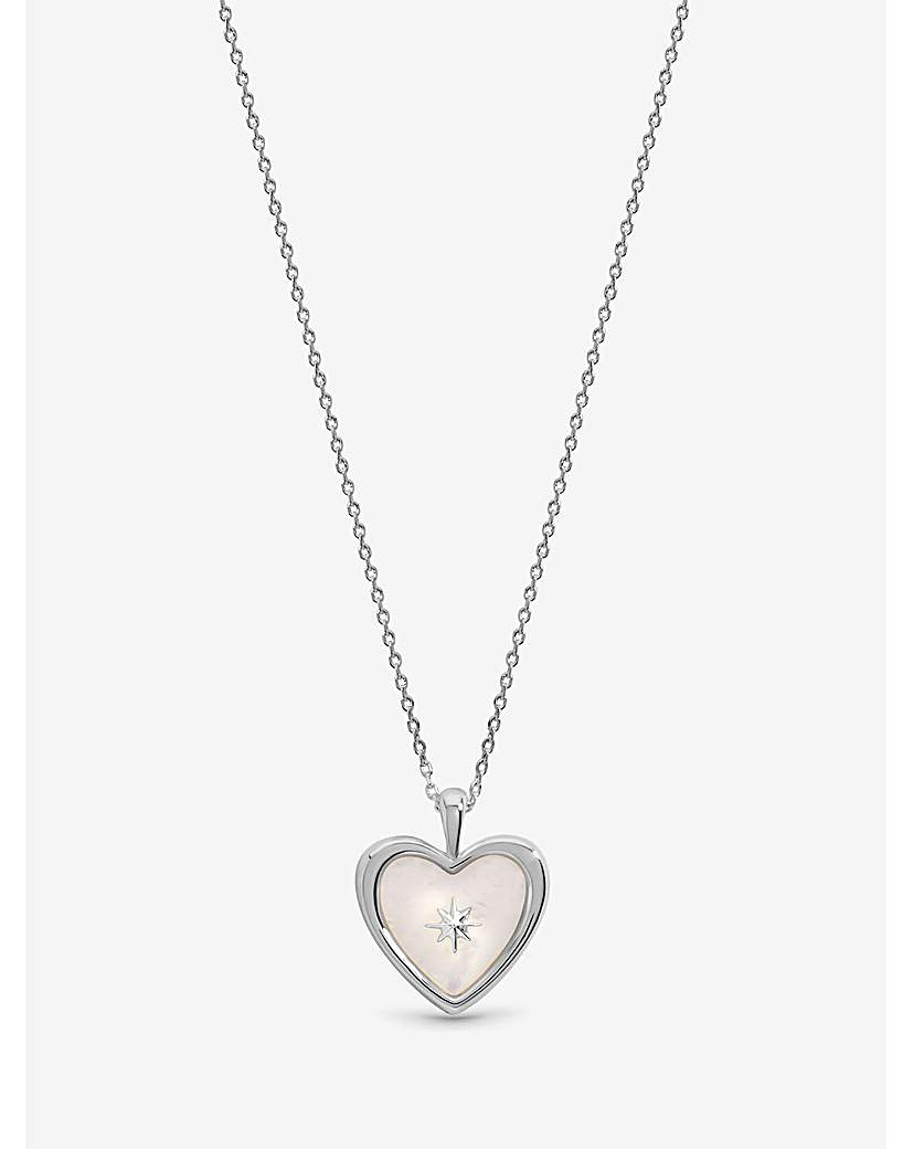 Inicio Sterling Silver Plated Mother of Pearl Heart Pendant - Gift Pouch Our Inicio Mother of Pearl Celestial Heart Pendant features a softly iridescent mother of pearl inlay set within a smooth sterling silver plated heart, finished with a delicate star detail at its centre and a compact design that adds gentle shimmer to any outfit. Wear this pendant alone for understated elegance or layer with other sterling silver plated chains for a luminous, curated look. Our 3 micron sterling silver plating uses a heavy, premium layer of silver that delivers a brighter finish, greater resistance to tarnish and wear, and significantly longer lasting quality than standard plated jewellery. Fastening: Lobster clasp Material: Sterling silver plated brass Chain length: 16, extender length: 2". Width: 15mm, length: 15mm. Comes in gift pouch "