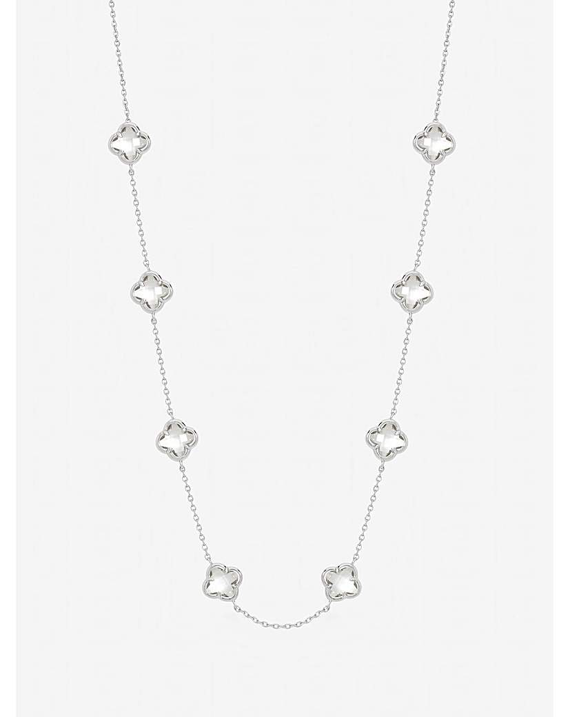Inicio Sterling Silver Plated Crystal Clover Necklace - Gift Pouch Our Inicio Crystal Clover Necklace features a delicate silver chain adorned with four evenly spaced clover stations. Each station showcases brilliant crystal stones cut precisely into the shape of a clover. This beautiful piece adds a charming sparkle and a touch of luck to your look, making it a perfect statement necklace for layering or elegant standalone wear. Our 3 micron sterling silver plating uses a heavy, premium layer of silver that delivers a brighter finish, greater resistance to tarnish and wear, and significantly longer lasting quality than standard plated jewellery. Fastening: Lobster clasp Material: Sterling silver plated brass Chain length: 16, extender length: 2". Width: 10mm, length: 10mm. Comes in gift pouch "