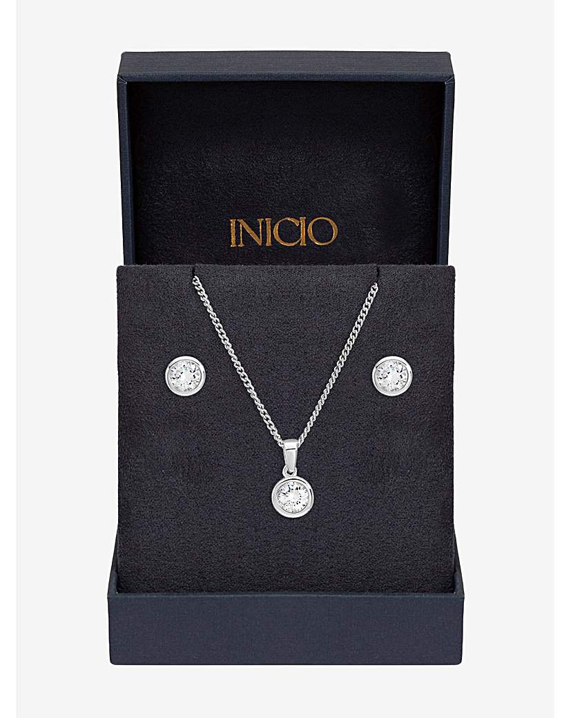 Inicio Sterling Silver Plated Cubic Zirconia Bezel Set - Gift Box Our Inicio Cubic Zirconia Bezel Set offers a sparkling and versatile combination of pieces. This set includes a matching necklace and stud earrings, each featuring a brilliant cubic zirconia delicately set in polished sterling silver plating . The sleek bezel design adds a modern touch while keeping the look timeless. Perfect for gifting, the set is beautifully presented in a beautiful gift box, making it ideal for birthdays, anniversaries, or any special occasion. Wear together for a coordinated look or mix and match with other favourites for everyday elegance. Our 3 micron sterling silver plating uses a heavy, premium layer of silver that delivers a brighter finish, greater resistance to tarnish and wear, and significantly longer lasting quality than standard plated jewellery. Fastening: Lobster clasp, post and bullet back Material: Sterling silver plated brass Chain length: 16, extender length: 2". Width: 6mm, 13mm, length: 6mm, 13mm. Non-returnable: in the interest of hygiene we are unable to exchange or refund this item unless faulty, this does not affect your statutory rights. Comes in gift box "
