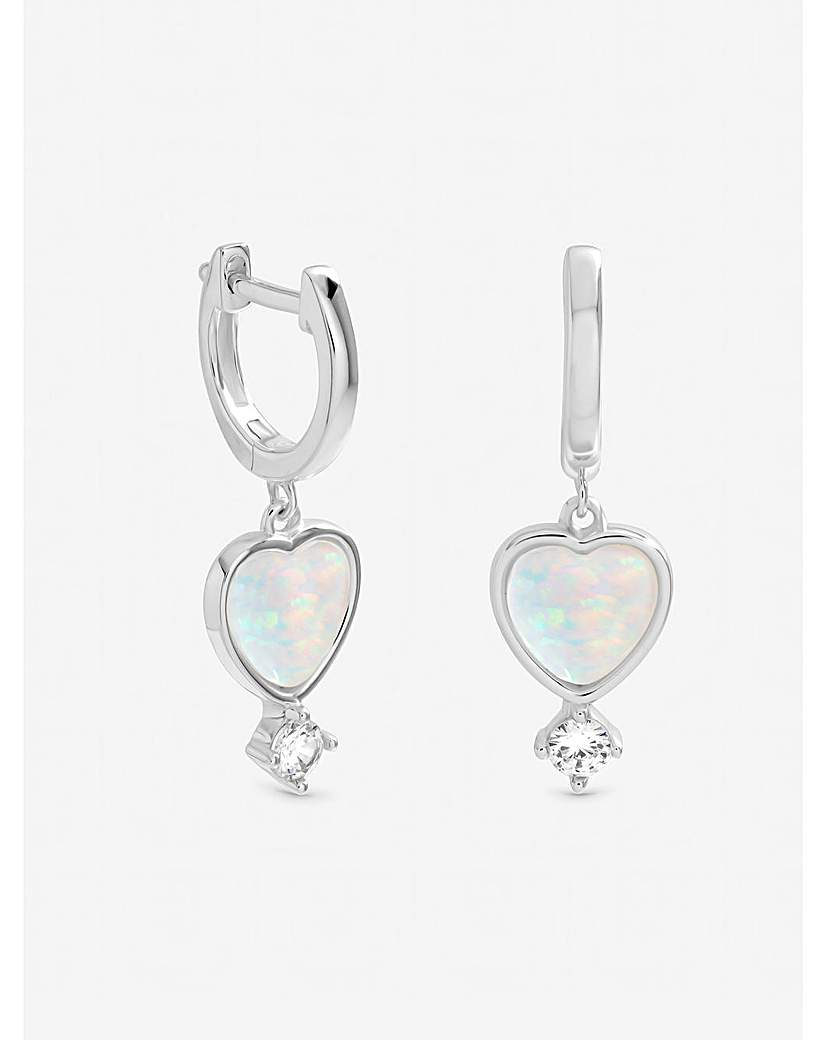 Inicio Sterling Silver Plated Opal Heart Charm Earrings Our Inicio Opal Heart Charm Earrings combine delicate charm with subtle sparkle. Crafted in polished sterling silver plating, each earring features a heart Shaped opal charm that catches the light beautifully, creating a soft, iridescent glow. Lightweight and versatile, they're perfect for everyday wear or for adding a gentle touch of elegance to any outfit. Our 3 micron sterling silver plating uses a heavy, premium layer of silver that delivers a brighter finish, greater resistance to tarnish and wear, and significantly longer lasting quality than standard plated jewellery. Fastening: Post and catch Material: Sterling silver plated brass Width: 12.5mm, length: 12.5mm. Non-returnable: in the interest of hygiene we are unable to exchange or refund this item unless faulty, this does not affect your statutory rights.