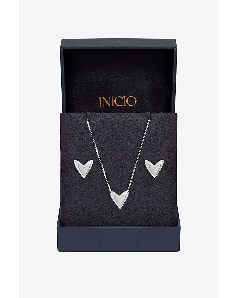 Inicio Sterling Silver Plated Puff Heart Set - Gift Box Our Inicio Puff Heart Set combines timeless charm with everyday elegance. Crafted in polished sterling silver plating, this set includes a matching pendant necklace and stud earrings, each featuring a soft, puffed heart design that catches the light beautifully. Presented in a snap shut gift box, ready to delight, this set makes a thoughtful and elegant gift for Mother's Day, Valentine's Day, birthdays, anniversaries, or any special occasion. Our 3 micron sterling silver plating uses a heavy, premium layer of silver that delivers a brighter finish, greater resistance to tarnish and wear, and significantly longer lasting quality than standard plated jewellery. Fastening: Lobster clasp, post and bullet back Material: Sterling silver plated brass Chain length: 16, extender length: 2". Width: 10mm, length: 10mm. Non-returnable: in the interest of hygiene we are unable to exchange or refund this item unless faulty, this does not affect your statutory rights. Comes in gift box "