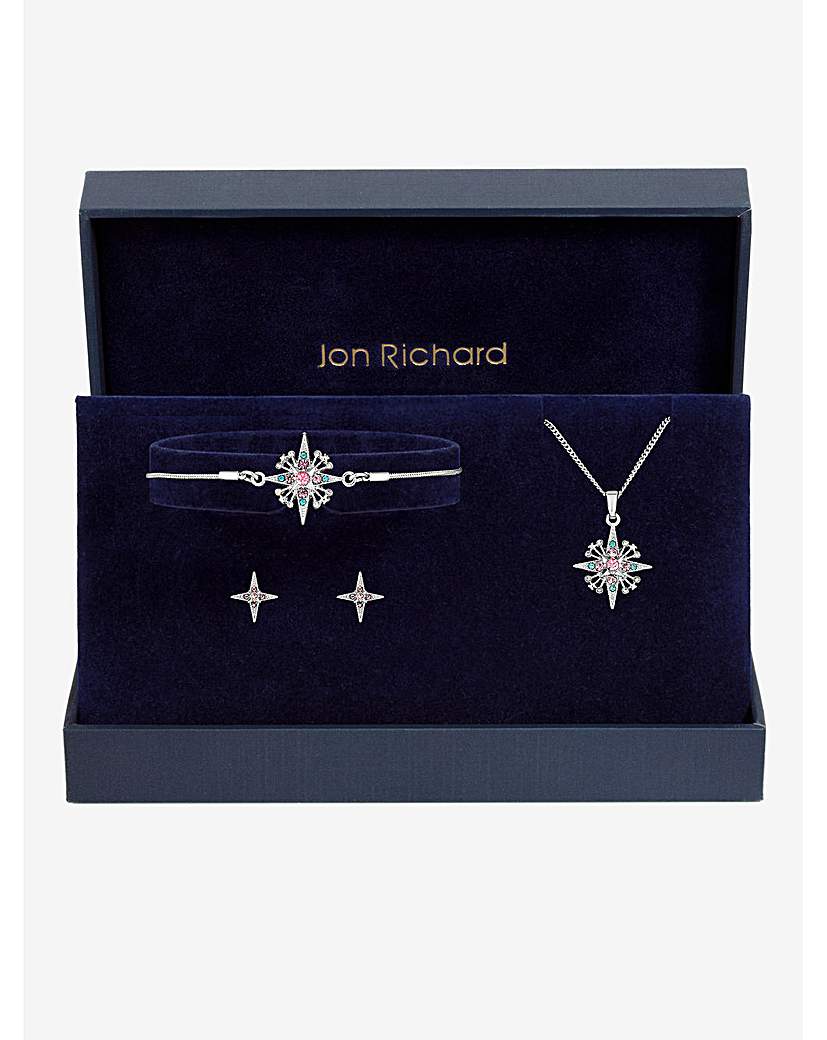 Jon Richard Silver Plated Diamond Cut Star Trio Set - Gift Box The Jon Richard Silver Plated Diamond Cut Star Trio Set twinkles with cosmic charm. Designed to capture the light of the stars, it's perfect for those who love to shine bright. Beautifully presented in a reusable gift box. Fastening: Lobster clasp, toggle, post and bullet back Material: Silver plated base metal Chain length: 16, extender length: 2". Width: 410mm, length: 410mm. Non-returnable: in the interest of hygiene we are unable to exchange or refund this item unless faulty, this does not affect your statutory rights. Comes in gift box "