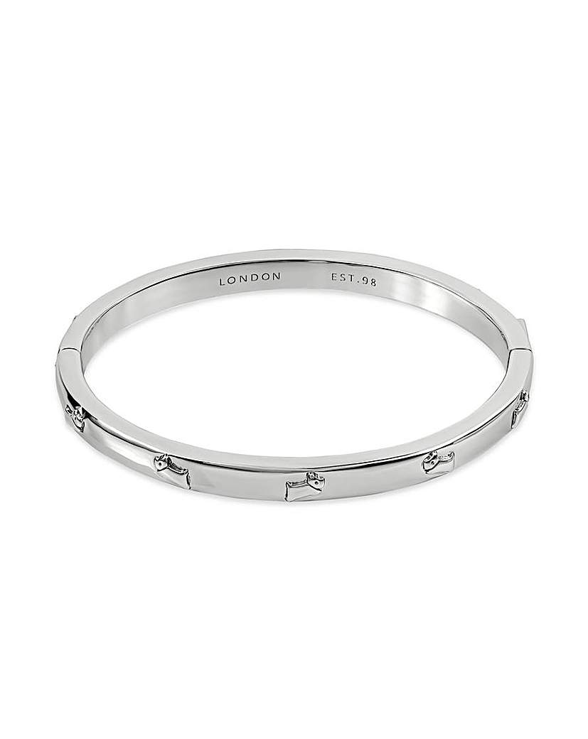 Radley Silver Plated Jumping Dog Bangle Radley Silver Plated Jumping Dog Bangle. A sleek and timeless accessory, featuring a raised Radley dog design that circles the wrist in delightful detail. Crafted in polished silver plating, it's finished with a secure push-button clasp for ease and comfort. Etched on the inside with 'Est . 98 & London' for a meaningful touch. Silver Plated Presented in Official Radley Packaging. Dimensions: 5.87 x 3.58 x 175