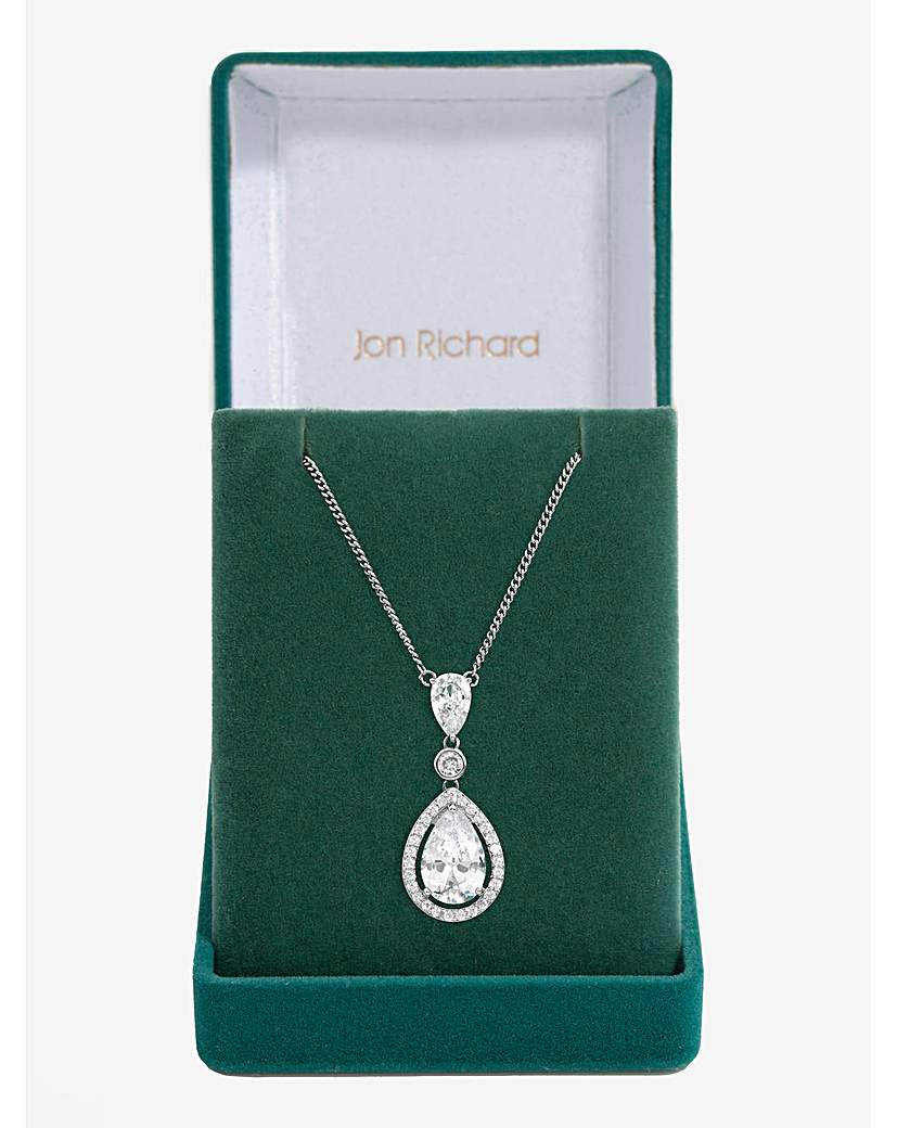 Jon Richard Rhodium Plated Cubic Zirconia Pendant Necklace The Jon Richard Rhodium Plated Cubic Zirconia Pendant Necklace is a timeless addition to any jewellery collection. Featuring a sparkling cubic zirconia set in a sleek rhodium-plated pendant, this necklace adds a touch of sophisticated glamour to both day and evening looks. Fastening: Lobster clasp Material: Rhodium plated base metal Chain length: 16, extender length: 2". Width: 30mm, length: 30mm. "