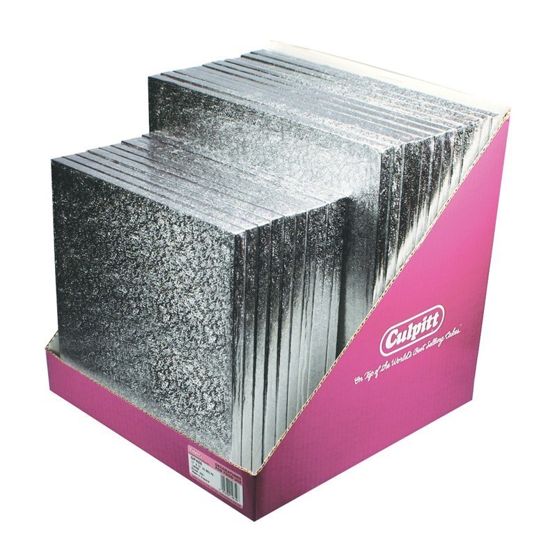 A selection of square silver foil cake boards in 2 sizes - 12" and 10"