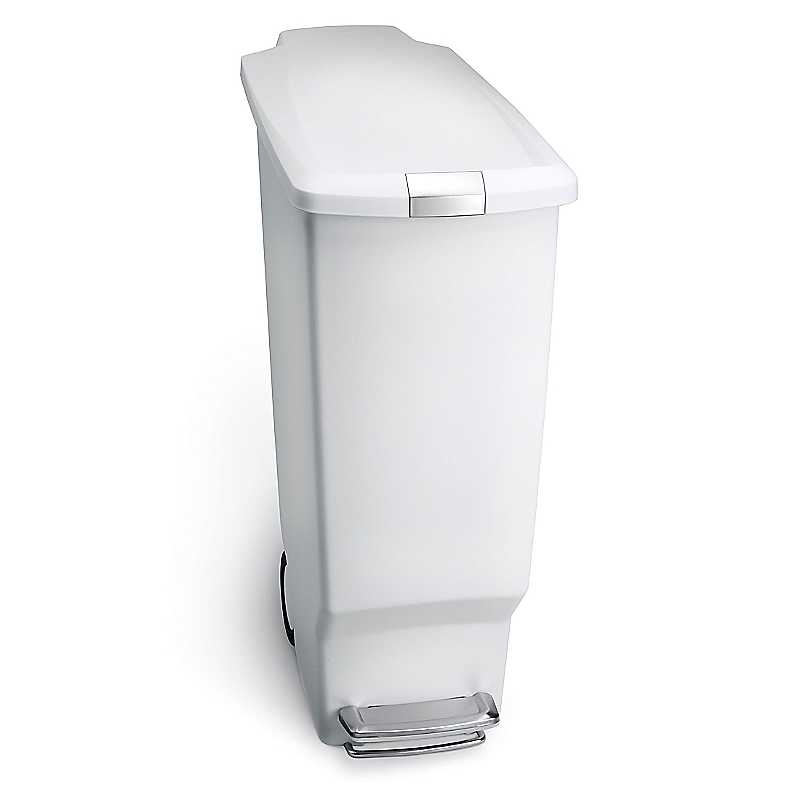 The simplehuman slim plastic pedal bin has a space-efficient shape that fits perfectly in tight spaces, like between cabinets. The strong steel pedal is designed to last, and our patented lid shox technology ensures a smooth, silent close every time. A slide lock helps keep rubbish in and pets and curious children out. The simplehuman code K liner fits this bin perfectly no bunching or slipping for a cleaner experience.Silent close lid: Our patented lid shox technology controls the motion of the lid for a slow, silent close.Lock the lid shut: A slide lock securely locks the lid to help keep pets and curious children from getting into the rubbish.Slim, space-saving shape: Designed to make the most of tight spaces.Stay-open lid: The lid stays open for as long as you like - perfect for longer chores.Built-in wheels: Built-in wheels make the bin easy to move.Custom fit liners: Our code K liners are designed to fit this bin perfectly so they don't slip. Extra-thick plastic and double-seam construction prevent rips and tears.Stainless Steel, PlasticDimensions approx. 63.2 x 25.6 x 47.2 cm
