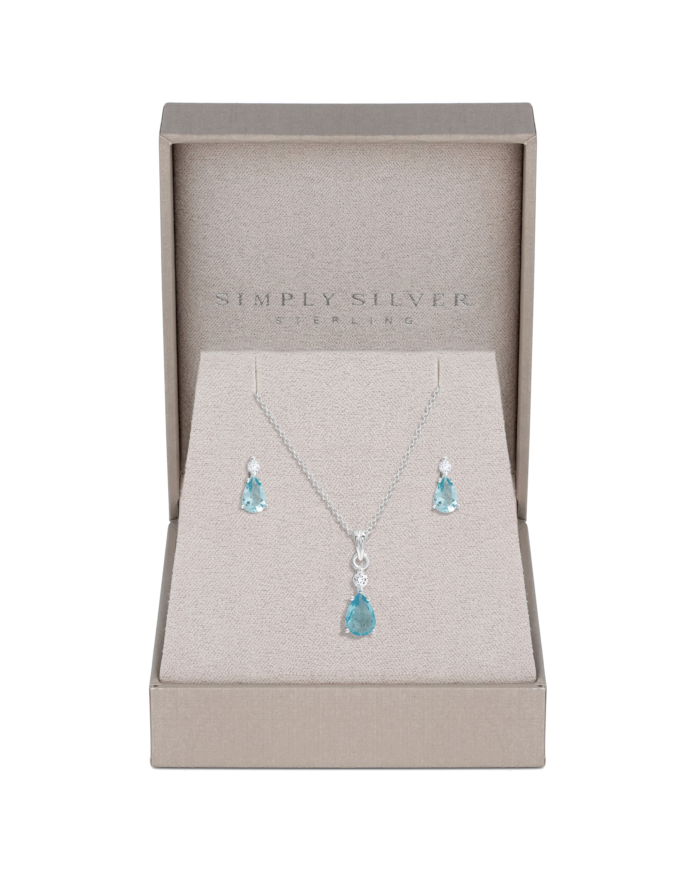 Simply Silver Sterling Silver 925 Cubic Zirconia and Aqua drop set- Gift Boxed Our iconic Simply Silver collection boasts fine, contemporary and meaningful 925 Sterling Silver jewellery. Add a touch of elegance with the Cubic Zirconia and Aqua Drop Set, featuring stunning aqua stones. Beautifully gift-boxed, this set is the perfect choice for any special occasion. Fastening: Lobsetr Clasp, Post and Bullet Back. Material: Sterling Silver 925 Width Dimension: 6mm. Length Dimension: 7mm. Chain Length: 16". Extender Length: 2". Comes In Gift Box