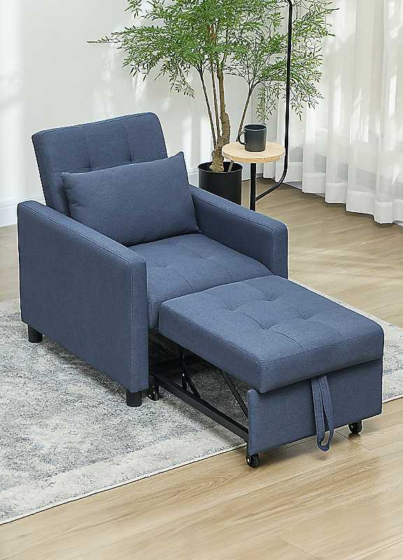 This versatile small chair bed offers a three-level adjustable backrest, allowing you to sit comfortably at angles of 105°, 155°, or fully reclined at 180°. Whether you are relaxing, watching TV, or reading, you can adjust it to suit your mood and needs. The 3-in-1 design easily transforms the piece from a single chair to a recliner, and then into a single bed by pulling out the leg section, which is equipped with four wheels for smooth movement. Comfort is a priority with a supportive back, breathable linen-feel upholstery, a well-padded seat, and an included pillow that has a removable, washable cover for easy maintenance. The chair bed features a sturdy wooden frame that ensures strong support whether you are sitting or sleeping.Weight capacity: 120 kgAssembly required (screwdriver not included)Adjustable backrest with three angles: 105°, 155°, and 180°3-in-1 design: chair, recliner, and single bedCushioned seat and pillow for comfort; pillow cover removable and washableStrong wooden frame for durability and supportLinen (100% Polyester), Foam, Eucalyptus Wood, MDFChair dimensions approx. 84H x 69W x 84D cmBed dimensions approx. 42H x 53W x 170DPlease remember to measure your available space before ordering. If using on an un-carpeted floor we recommend rubber or felt protection pads be used under the legs to avoid damage to your floors.