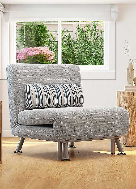 This versatile chair is designed with a space-saving, convertible layout that's perfect for small apartments. It effortlessly transforms into a single bed, providing both functionality and flexibility for those working with limited space. Offering five adjustable backrest positions and thick foam padding, the chair allows you to personalize your comfort, whether you are sitting or sleeping, ensuring a restful experience every time. Built with a durable, powder-coated steel frame, it supports up to 150 kg, making it a reliable choice for both seating and sleeping needs. The elegant linen-look upholstery not only adds a touch of style but is also soft on the skin, making it perfect for daily use in compact living spaces. For easy maintenance, the removable pillow cover is washable, allowing you to keep your space-saving furniture fresh with minimal effort. Plus, its made from flame-retardant materials, adding an extra layer of safety to your home.Maximum load 150 kg, assembly requiredWeight capacity:150 kgMade from flame retardant materials3-in-1 design: a chair, a chaise longue and a sleeper bedFive-position back, reclines to maximum 180°Padded, with comfortable linen-feel upholstery and pillowPowder coated metal frame means a strong and supportive structureRemovable and washable cover of folding bed chair for hygieneLinen (100% Polyester), Steel, SpongeChair dimensions approx. 75H x 75W x 70D cmBed dimensions approx. 25H x 180W x 75D cmSeat size approx. 75W x 58D cmSeat to floor height approx. 38 cmPlease remember to measure your available space before ordering. If using on an un-carpeted floor we recommend rubber or felt protection pads be used under the legs to avoid damage to your floors.