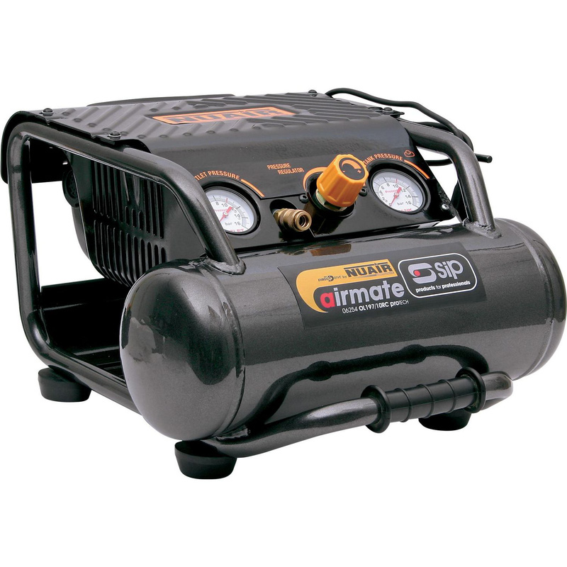 All-in-one compressor with a lightweight and compact design for easy portability and position in a variety of applications, but particularly in low pressure and low volume applications such as tyre inflation, cleaning and nailing or stapling. Mounted on robust feet, the OL197/10RC is fully integrated with a top-mounted gripped foot plate for added versatility, helping the user to complete their tasks no matter the environment. Below this, a built-in control panel is fitted with an easy-to-read gauge and ergonomic pressure regulator. This all-in-one compressor has a lightweight and compact design, making it easy to carry and position. It’s particularly suited to low-pressure and low-volume applications such as tyre inflation, cleaning, nailing or stapling. Mounted on robust feet, the compressor has an integrated top-mounted gripped foot plate for added versatility. A built-in control panel features an easy-to-read gauge and an ergonomic pressure regulator. * Available in 230V or 110V – choose the right model for your workplace * Oil-free system – for a maintenance-free, clean air supply * Lightweight and compact – easy to move, transport and store * Integrated foot plate – provides extra stability and versatility * Easy-to-read control panel – with gauge and pressure regulator * Efficient cooling system – for durability and an extended work life | SIP Airmate OL197/10RC 10ltr Oil-Less Direct Drive Compressor 110V in Black