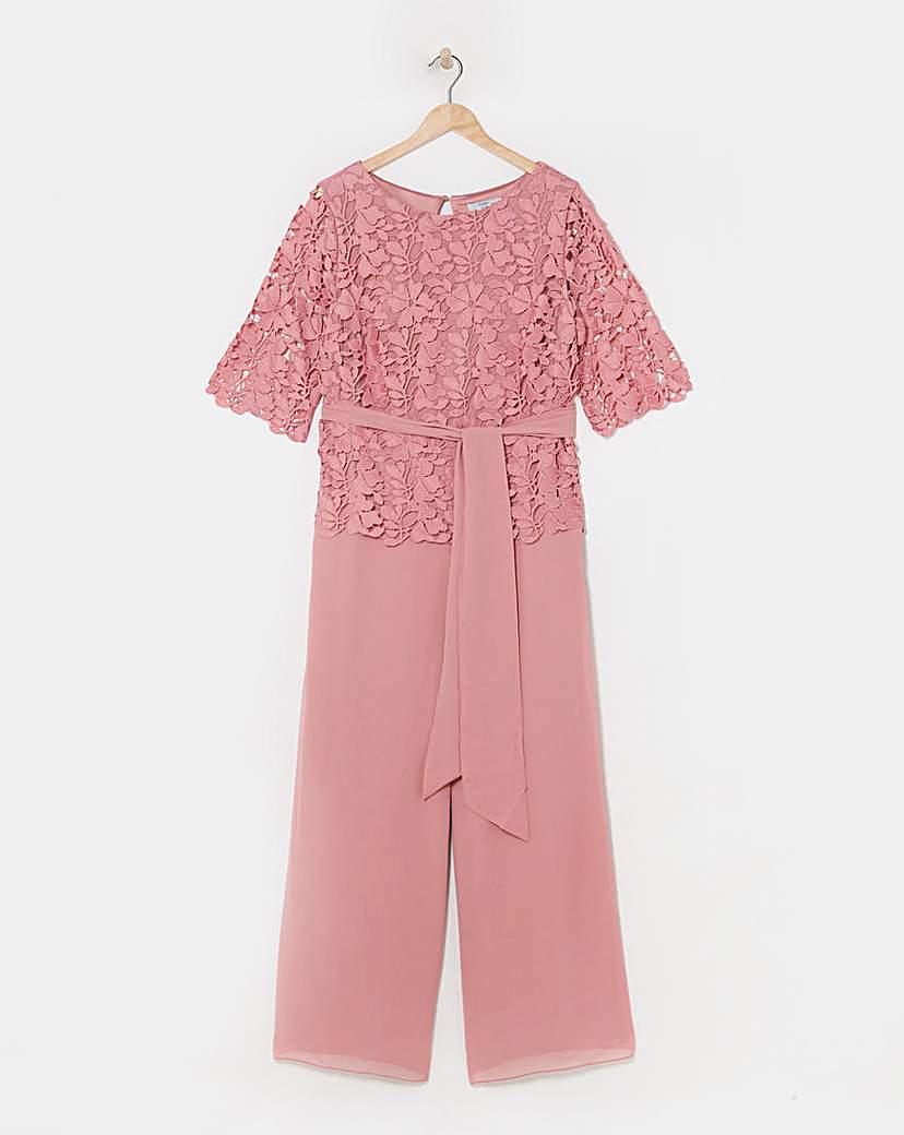 This gorgeous jumpsuit features a lace bodice and flattering chiffon trousers and comes with a matching belt. Jumpsuit is lined in a satin fabric. Fastens with a centre back concealed zip. The perfect piece for Mother of the bride or wedding guest.