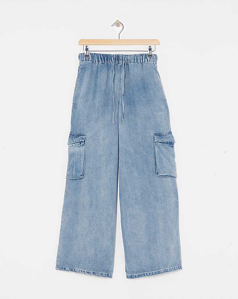 Our tencel utility wide leg jeans are the perfect day-to-night summer staple. Style with a simple tee for a casual everyday look. Featuring: a bleach wash denim fabric, utility pocket detailing, wide leg silhoutte, stretch denim fabric, and both button and zip fastening.