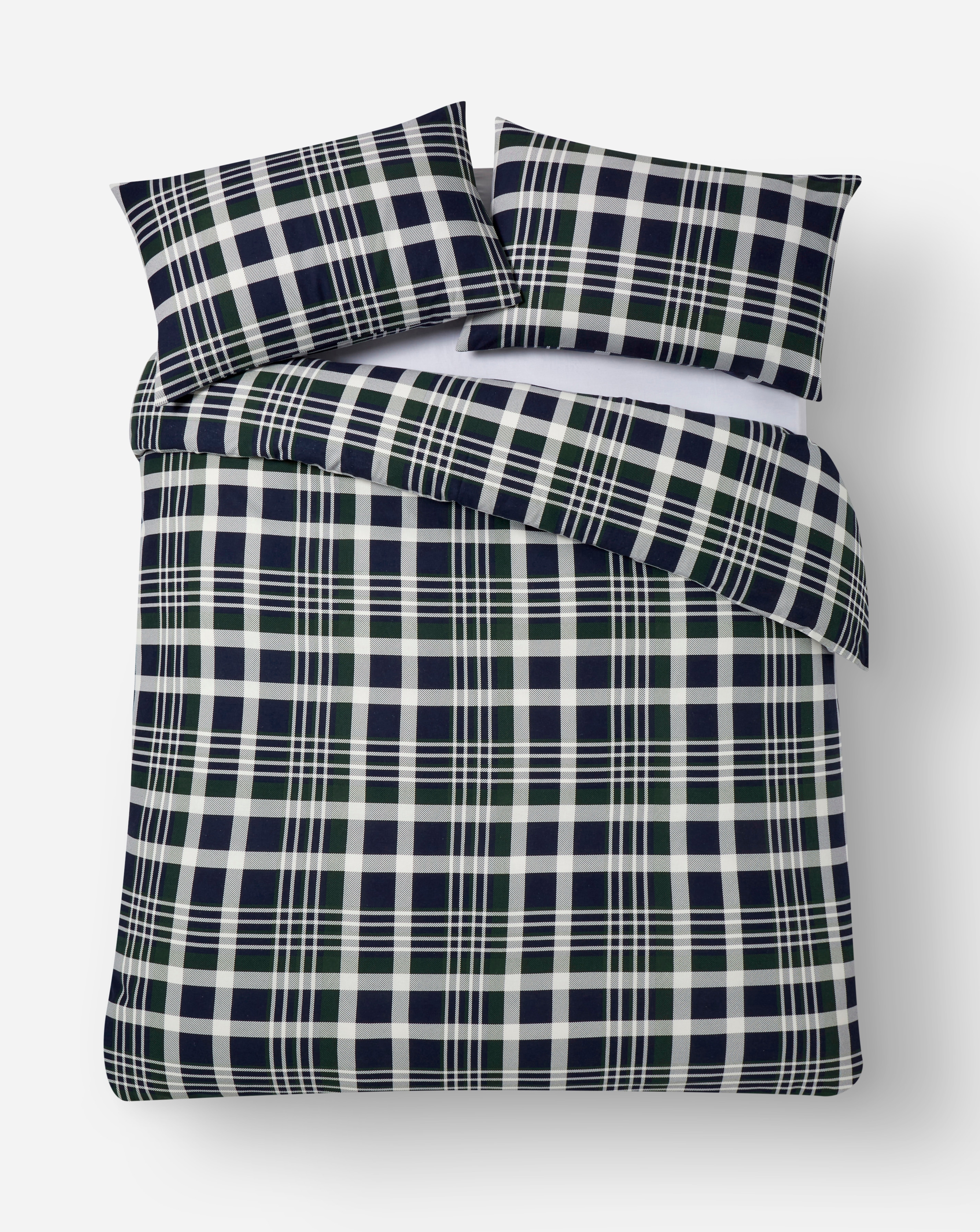 The Skye Duvet Cover Set is crafted from beautifully soft, 100% brushed cotton. This navy set features a classic check pattern inspired by the rugged beauty of the Scottish Highlands. Set includes One Duvet cover and 2 Pillowcases. 100% Cotton. Machine wash on 40 Degree, Do Not Bleach, Tumble Dry on low heat, Iron on Low Heat, Do not Dry Clean.