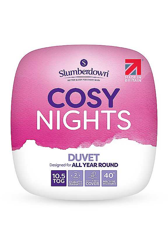 The Slumberdown cosy nights 10.5 tog all year round duvet features a soft touch microfibre cover and snuggly hollowfibre filling, ensuring you achieve a cosy night's sleep throughout the year. As well as being extremely comfy, you can also sleep easy knowing that there's nothing in this duvet that can cause allergic reactions, as it's naturally hypoallergenic. The cosy nights duvet is lightweight yet snuggly, and gently wraps around the contours of your body so it stays with you as you move during the night. Being a mid-weight 10.5 tog duvet, it's a great option for use all year round. 10.5 Tog Non-Allergenic Machine washable Tumble dry Cover: 100% Microfibre Filling: 100% Hollowfibre