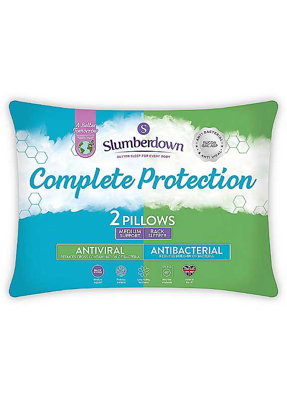 The pillows in this Slumberdown complete protection antiviral medium support back sleeper pillow 2 pack are specifically made with an innovative fast-acting antibacterial and antiviral treatment. Developed and independently tested by the experts at the Rudolf Group, these clever pillows help to reduce the build-up and cross-contamination of bacteria and enveloped-virus on the cover, so that you can enjoy long-lasting freshness and a healthy sleep space.RUCO®-BAC AGP is proven to reduce tested viruses in the coronaviradae family by 99%, even after numerous washes, as per the international standard ISO18184:2019. Registered microstructures within the fabric of the pillow transport silver ions that stop growth and cross-contamination of bacteria and virus on any textile.These pillows contain a lovely and snuggly hollowfibre filling that's hypoallergenic, and the comfortable soft touch microfibre cover feels wonderful to sink into. Having a medium support level, this Complete Protection pillow pair is a great choice for back sleepers, or for those who prefer a versatile, mid-depth pillow. Slumberdown Pillows Features: Pack of 2 Machine wash at 40°C Cover: 100% Microfibre Filling: 100% Hollowfibre