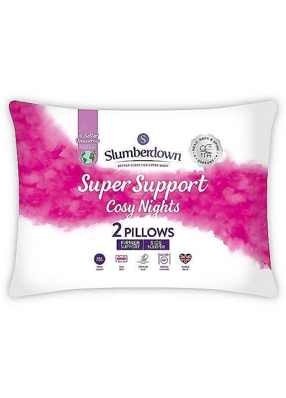 Slumberdown's popular cosy nights pillow, now with a super support upgrade! For a cosy night's sleep, combined with the firmer support that side sleepers especially benefit from. Just like the original Slumberdown cosy nights pillow, this version also contains a soft and fluffy hollowfibre filling and features the same soft touch microfibre cover that feels lovely and cosy to sink your head into, surrounding you with a comfy feeling so that you can enjoy a great sleep all night long. Having received a super support makeover, this Slumberdown cosy nights super support pillow offers optimum support, thanks to a unique core block for your head, neck and spine to rest at the right position and reduce everyday aches and pains.Firm supportSoft MicrofibrePack of 2Machine washable Tumble dryCover & Filling: 100% Polyester