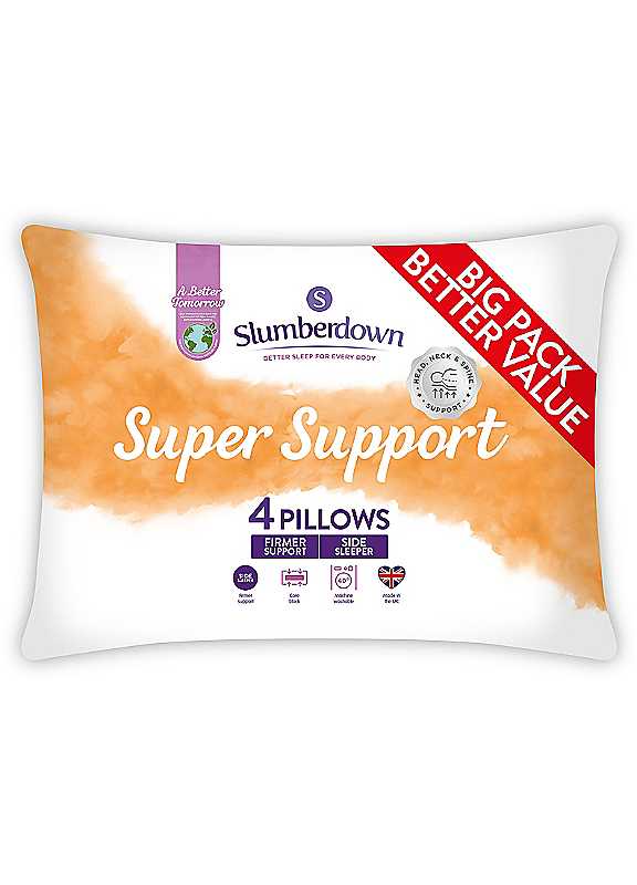 The pillows in this Slumberdown super support pillow 4 Pack have been developed with a unique core block in their centre which holds your head at just the right position for optimum support - ideal if you sleep on your side. Side sleepers should use a firm support pillow to ensure they benefit from the correct alignment of the head, neck and spine which in turn encourages the spine to straighten, helping to reduce everyday aches and pains associated with a pillow that's not firm enough for side sleeping. The internal foam core is complemented by a wonderfully supportive hollowfibre filling for a sleep that's comfortable as well as healthy, and the soft touch microfibre cover feels smooth and cosy to sink your head into providing all you need for a great night's sleep.All Around SupportPack of 4Machine washable Tumble dryCover & Filling: 100% Polyester