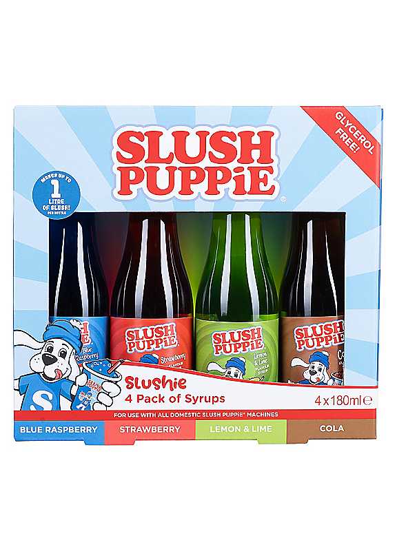 Cool off with a blast of classic flavour! The SLUSH PUPPiE 4 Pack of Syrups includes four fan-favourite varieties: Blue Raspberry, Strawberry, Lemon & Lime, and Cola. Each 180ml bottle is packed with vibrant taste and is completely glycerol-free-perfect for use in your home slushie machine or to mix up icy drinks for parties and hot days. Whether you're recreating nostalgic summer moments or treating the kids to frozen fun, this syrup set delivers the full SLUSH PUPPiE experience in every sip. Brand: Slush Puppie Suitable for vegetarians & vegans 4 x 180ml Syrups Please note: Machine not included Not suitable for children under the age of 4.