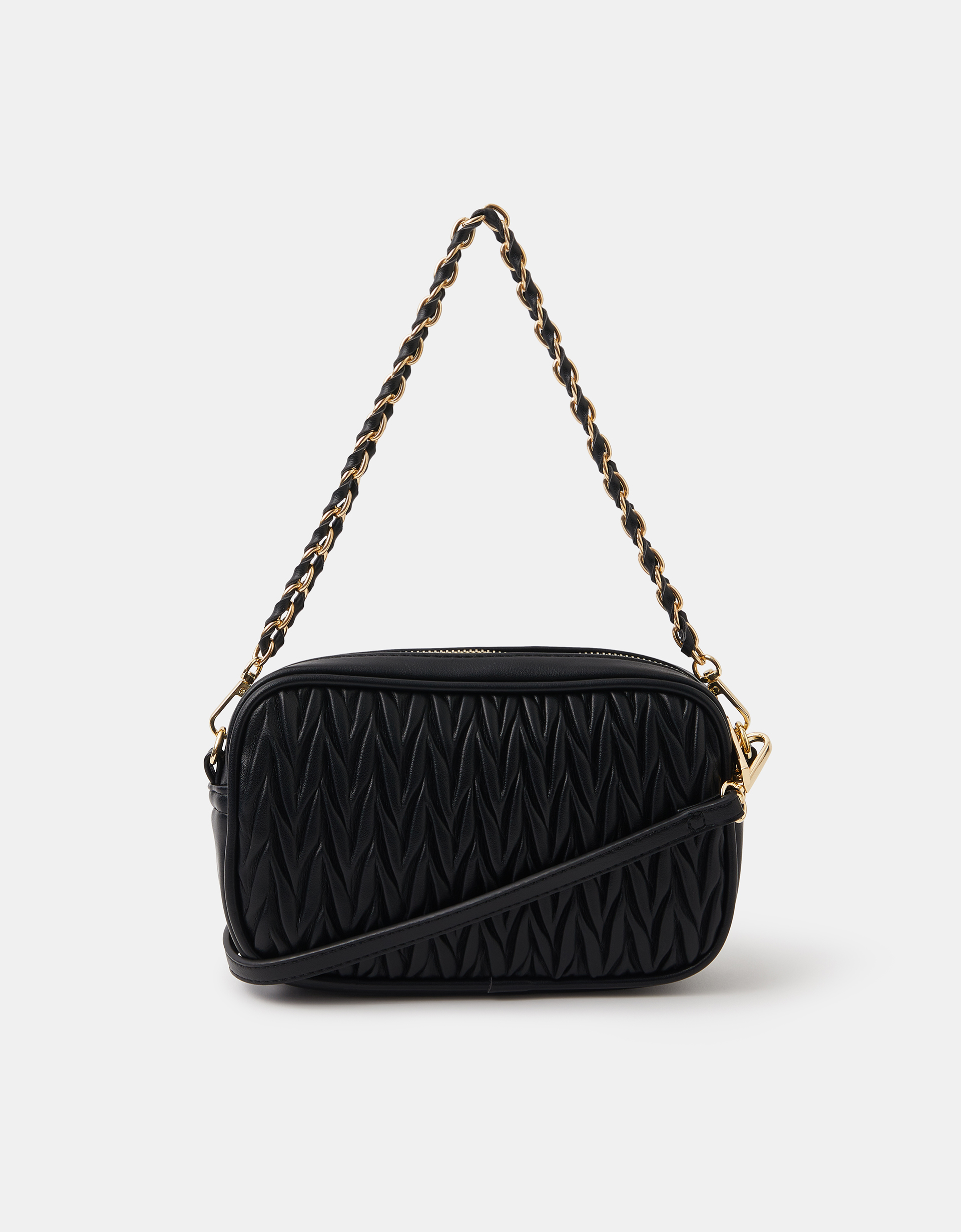 Small in size but big in style, this bag is a chic addition to your collection. Made of faux leather with a ruched, wrinkled texture, it's finished with a zip fastening and two detachable straps with options to sling over the shoulder or style across the body. Black