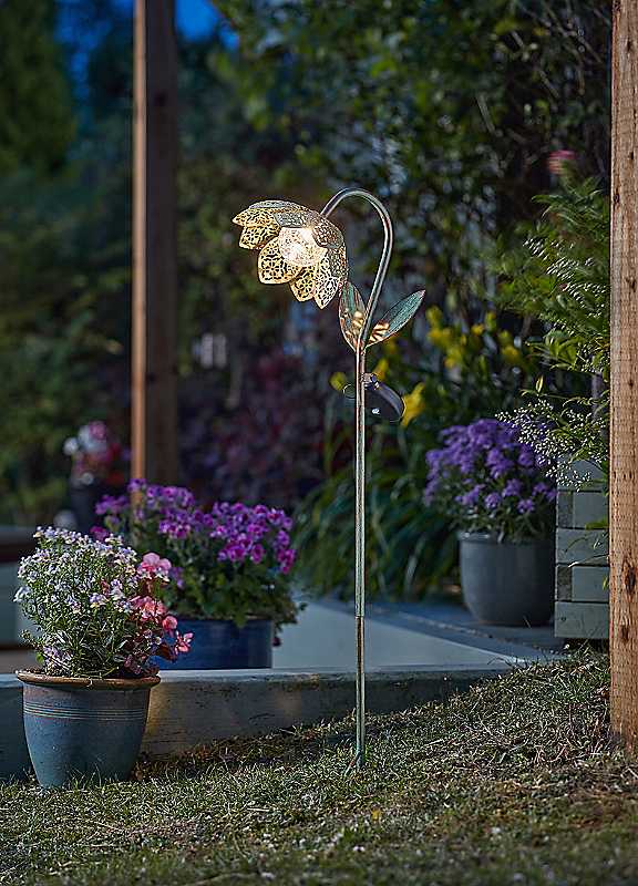 Stunning lotus design casts a magical silhouette pattern at night and serves as a beautiful statement piece by day! Natural green finish has been complemented with a bronze brush.8cm white/colour-changing crackle ball sits elegantly as the solar-powered centre-piece! Perfect for garden paths, driveways, patios, pots and flower beds.Easy to install: charges by day, shines by night - no wires or electricity needed! Ideal as a stand-alone garden feature or use multiple to illuminate pathways and larger outdoor areas. Great gift for garden parties, retirement, birthdays, housewarming, wedding or just because you care.Weight approx. 0.73 kgBattery size: 1 x AA Ni-MH RechargeableManufacturer's 1 year guaranteeSolar: YesMains power: NoBattery includedReady assemblyWipe clean only, Avoid household cleaners & abrasivesMetal, Glass, PlasticDimensions approx.90 cm x 26.5 cm x 20 cm