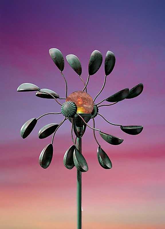 Double sided wind spinner with decorative cupped wind catchers. Verdigris effect finish. Solar crackle ball with colour changing effect.Weight approx. 1.12 kgManufacturer's 1 year guaranteeSolar: YesMains power: NoBattery includedWipe clean only, Avoid household cleaners & abrasivesMetal & Electrical ComponentsHeight approx. 130 cmDimensions approx. 129 cm x 36 cm x 20 cm