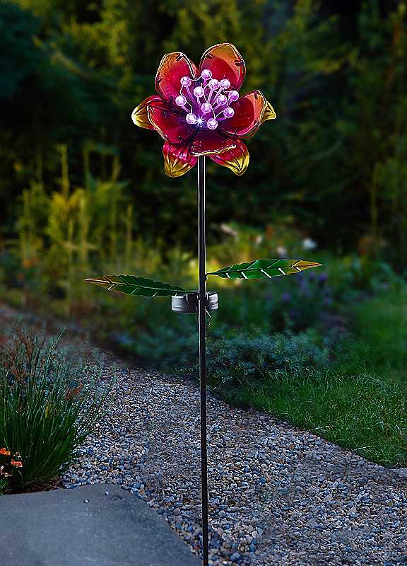 Decor by day, light by night TMHand-painted layered glass petals shimmer beautifully in sunlight, adding a touch of elegance to any garden. 10 cool white LED bulbs create a magical glow at night, perfect for garden paths, patios, or flower beds.Easy to install: charges by day, shines by night - no wires or electricity needed! Ideal as a stand-alone garden feature or use multiple to illuminate pathways and larger outdoor areas.Manufacturer's 1 year guaranteeWeight approx. 0.39 kgSolar: YesMains power: NoBattery includedBattery size: 1 x AAA Ni-MH RechargeableReady assemblyWipe clean only, Avoid household cleaners & abrasives60% Metal, 30% Plastic, 10% Electrical ComponentsDimensions approx. 85.5 cm x 16.5 cm x 13 cm