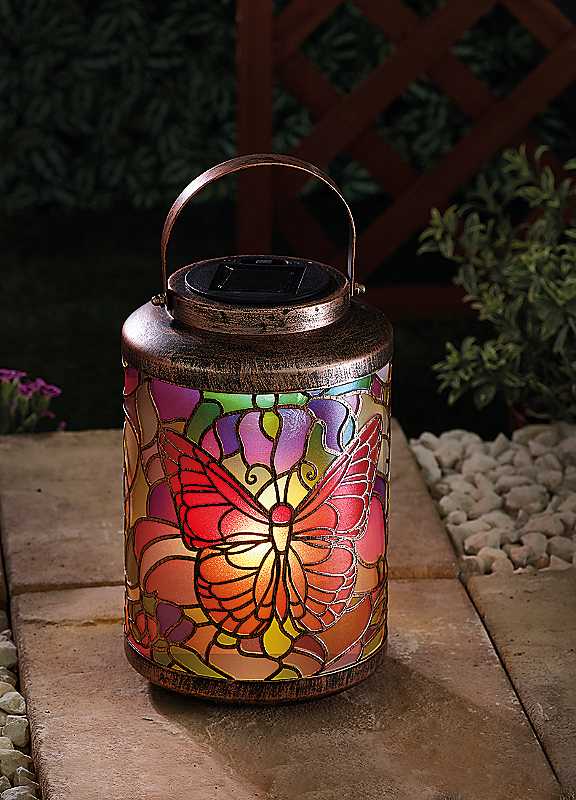 Mesmerising butterfly solar lantern that decorates by day and lights up at night! Features a hand-painted finish that adds a touch of colour and class to any outdoor space!Metal bronze-effect lantern with Intricate silhouette Butterfly design creates a stunning stained glass lighting effect. Hang from trees, hooks, fences, entrances, anywhere that needs a touch of nature, or place on/around tables and seating areas. Charming as a stand-alone feature or use multiple to illuminate pathways and larger outdoor spaces.Easy to install: charges by day, shines by night - no wires or electricity needed!Weight approx. 0.5 kgManufacturer's 1 year guaranteeSolar: YesMains power: NoBattery includedBattery size: 1 x AA Ni-MH RechargeableReady assemblyWipe clean only, Avoid household cleaners & abrasivesMetal & Electrical ComponentsDimensions approx. 24 cm x 16 cm x 16 cm