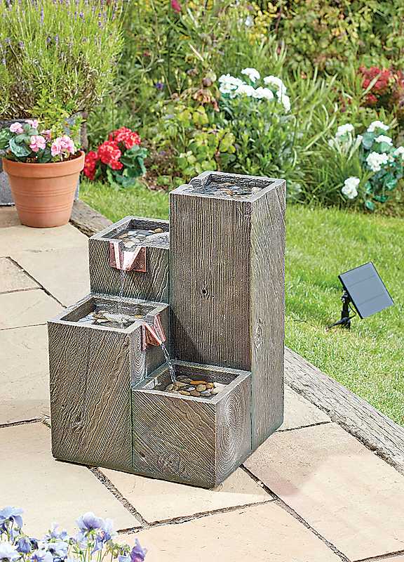 Gentle cascading water-feature streams create a soothing, spa-like atmosphere in your garden or patio. Lightweight geometric polyresin design. Hybrid power, combining solar and battery power to extend operating time and give a constant water flow morning-evening. Perfect for any garden, patio, outdoor space, zen garden or balcony. Remote solar panel for maximum sunlight.A thoughtful gift for anyone who enjoys mindful moments, outdoor d©cor, or a touch of tranquillity in their space.Quick & easy to installWeight approx. 7.5 kgManufacturer's 1 year guaranteeSolar: YesMains power: NoBattery includedBattery size: 1 x 18650 Li-ion RechargeableReady assemblyWipe clean only, Avoid household cleaners & abrasivesMetal & Electrical ComponentsDimensions approx. 58 cm x 40 cm x 40 cm