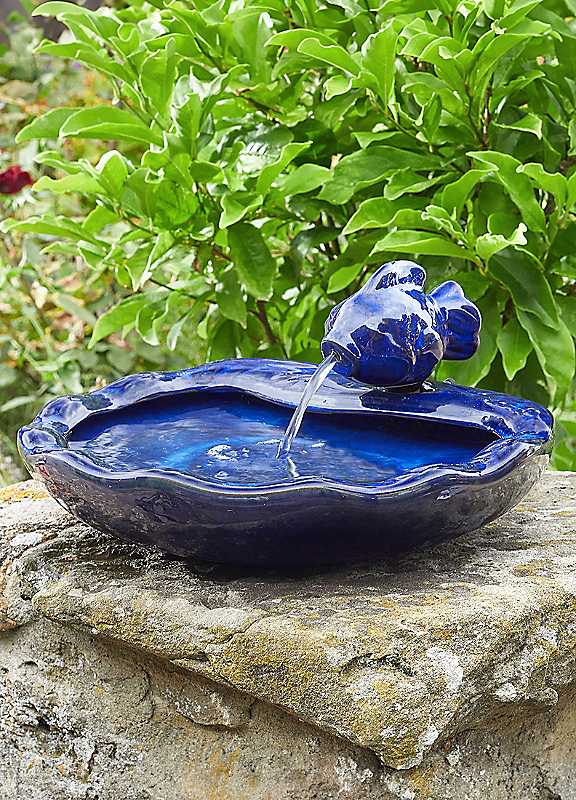 This fun blue glazed ceramic solar powered fish water feature will brighten any garden or patio. Water flows constantly through mouth of fish into bowl, creating a relaxing atmosphere in your garden, patio or balcony. Utilises a low voltage solar pump to constantly re-circulate water from the main bowl reservoir Easy to install and use - no mains wiring Works in direct sunlight with an remote solar panel Dimensions approx. 16 x 37 x 32 cm (6¼ x 14½ x 12½ in)