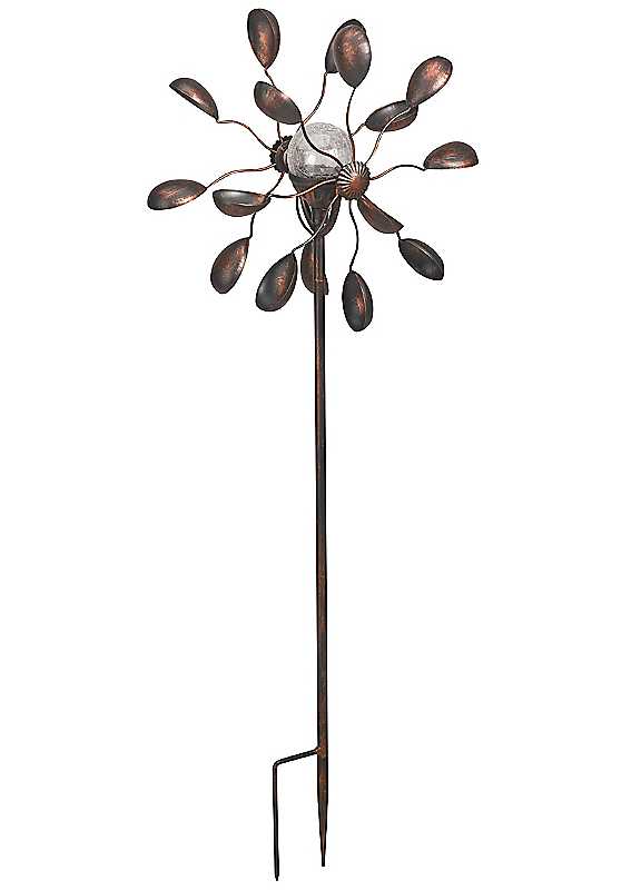 Solar powered illuminated windspinner, featuring a solar crackle ball globe, with colour changing LED light. Solar powered colour changing LED Height approx. 1.3 metres