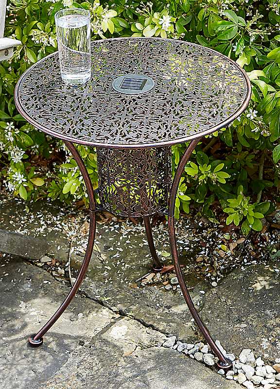 Entertain in style with the magical Illumina Illuminated table. Come dusk, the integral table light will automatically light up and create a beautiful scroll pattern. Hand crafted brushed metal frame No wires Will illuminate for up to 6 hours each day Charges in direct sunlight Folds flat for easy storage Size approx 60H x 45D cm (23½ x 17¾ ins) Simple assembly required