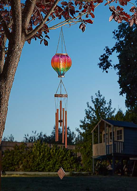 Blend two best-sellers together and what do you get? A Rainbow Balloon Flaming Windchime of course!Creates a soothing chime in the breezeRealistic warm flaming effect, using CoolFlame technologyHang from trees, brackets, fences, entrances, anywhere that needs a soothing soundscape and charming solar lightsIdeal as a stand-alone feature or use multiple to illuminate trees, pathways and larger outdoor areas.Easy to install: charges by day, shines by night - no wires or electricity needed!Weight approx. 0.44 kgManufacturer's 1 year guaranteeSolar: YesMains power: NoBattery includedBattery size: 1 x AAA Ni-MH RechargeableReady assemblyWipe clean only, Avoid household cleaners & abrasives50% Metal, 40% Plastic, 10% SolarDimensions approx. 104 cm x 14 cm x 14 cm