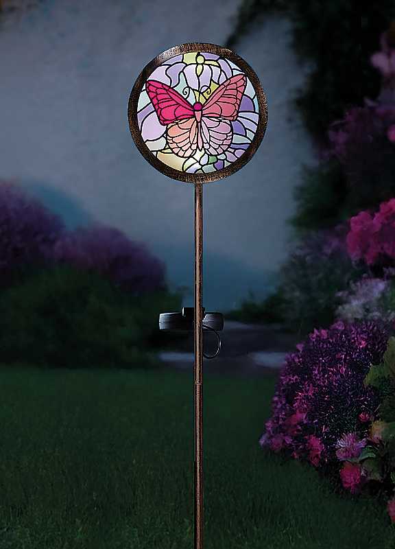 Decor by day, light by night TMThis beautiful butterfly solar stake-light design features a hand-painted finish that adds a touch of colour and class to anywhere outdoors! Intricate silhouette butterfly design creates a stained glass lighting effect. Perfect for garden paths, driveways, patios, pots and flower beds.Easy to install: charges by day, shines by night - no wires or electricity needed! Ideal as a stand-alone garden feature or use multiple to illuminate pathways and larger outdoor areas.Boxed for perfect giftingManufacturer's 1 year guaranteeSolar: YesMains power: NoBattery includedBattery size: 1 x AA Ni-MH RechargeableWeight approx. 0.36 kgReady assemblyWipe clean only, Avoid household cleaners & abrasivesMetal & PlasticDimensions approx. 89 cm x 15 cm x 11 cm