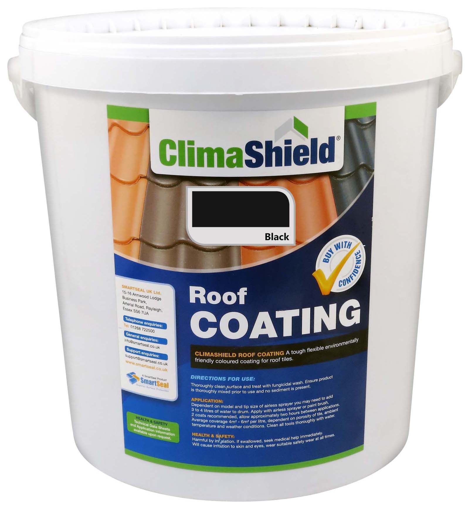SmartSeal ClimaShield Black Roof Coating - 20L - Climashield Roof Coating is used to renew the look of ageing, porous concrete roof tiles. Superior to a roof paint, it will transform the look of old concrete roof tiles and acts as a waterproof roof paint sealer as well as a coloured roof coating. Once applied, the waterproof roof paint or roof paint sealer will aesthetically transform the roof, leave it water resistant and protect it from the harmful effects of UV light. The roof coating will also allow 'flexing' and movement within the roof tile. Technically this is highly important because exposure to heat and cold will cause roof tiles to expand and contract. ***SUITABLE FOR CONCRETE ROOF TILES ONLY***